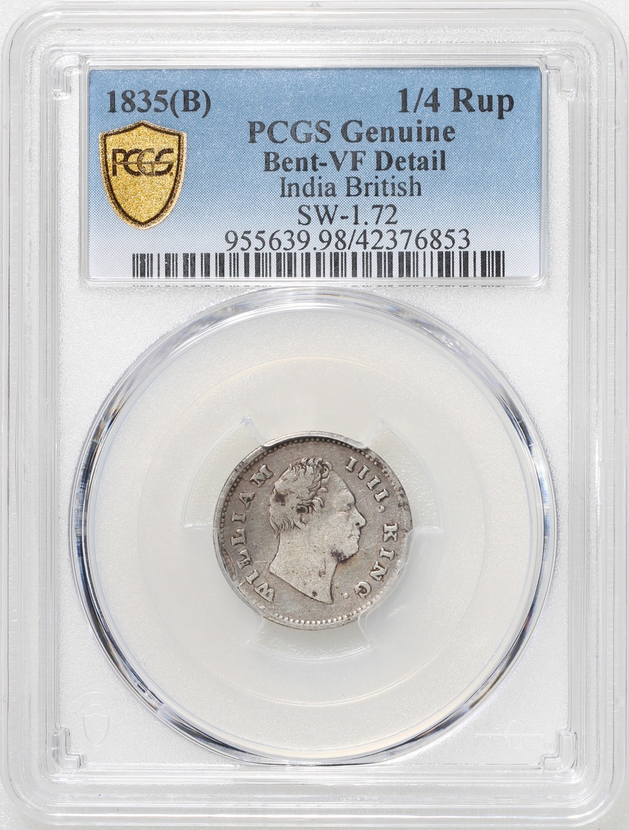 India, British, a pair of silver 1/4 rupee, 1835(B) and 1840(C or B), William IIII and Victoria on obverse respectively, PCGS VF Detail, bent and XF Detail, cleaned.(2) #42376853-4