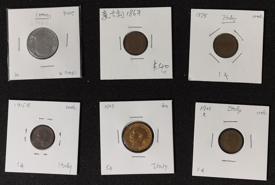 意大利錢幣6枚一組,包括1867M,1895,1905R及1915R 1分,1923年5分,及1940R 20分,F至EF,建議預覽