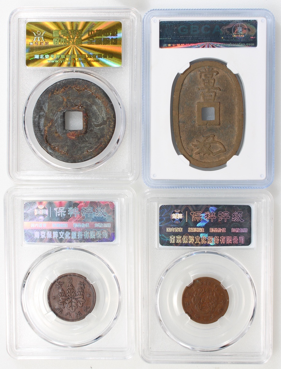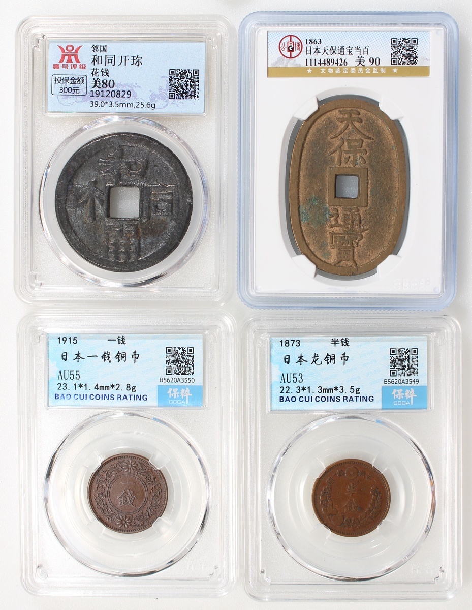 日本錢幣4枚一組,包括半錢,一百文,天保通寶及和同開珍,均經第三方評級公司封套,售後不設退換