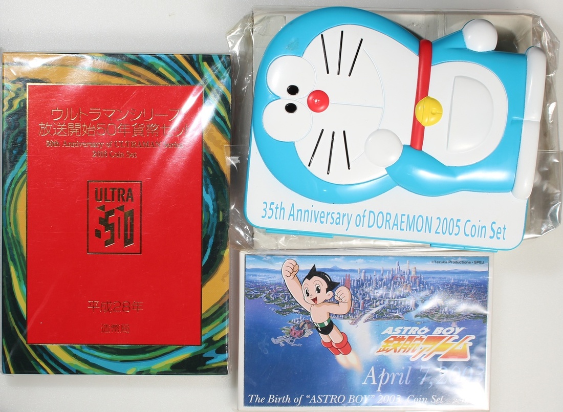 Japan, 3x coin sets, Astro Boy, 2003, 35th Anniversary of the Doraemon Seris, 2005, and 50th Anniversary of the Ultraman Series, 2016,
