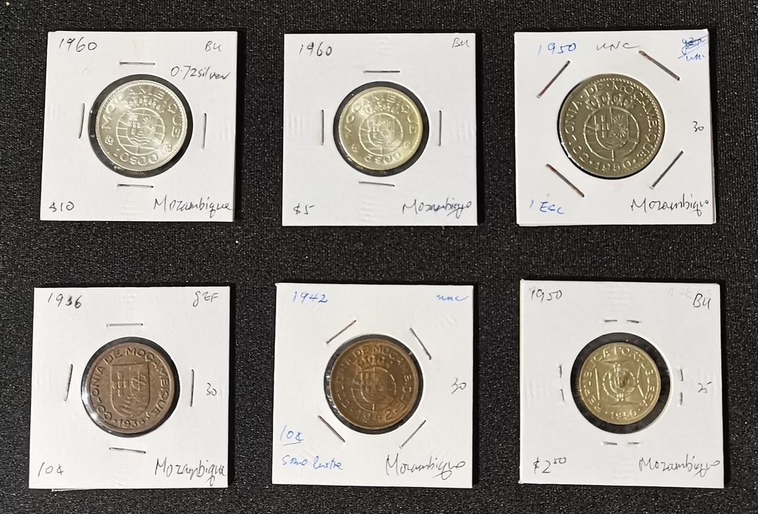 莫桑比克錢幣6枚一組,包括1936及1942年10分,1950年2.5盾,1950年1盾,1960年5盾及1960年10盾,均約AU品相,若干帶原光