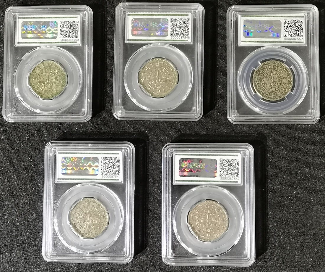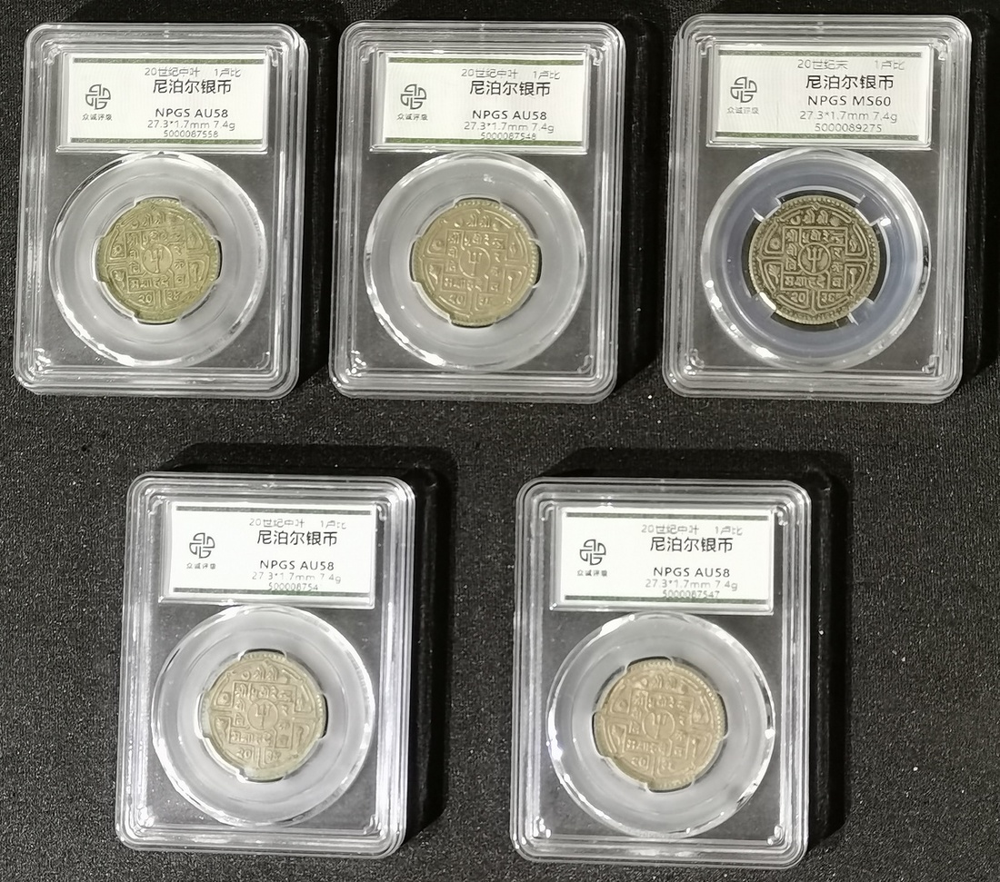 二十世紀中期尼泊爾盧比銀幣5枚一組,均經第三方評級公司NPGS封套AU58至MS60,建議預覽,售後不設退換