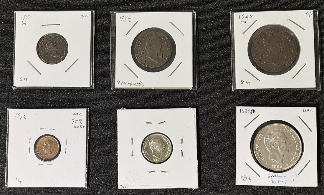 西屬菲律賓錢幣6枚一組,包括1912年1分,1858BA 2馬拉維迪斯,1830年4馬拉維迪斯, 1848JA 8馬拉維迪斯,1885年10分及1885A 50分,EF或更好品相
