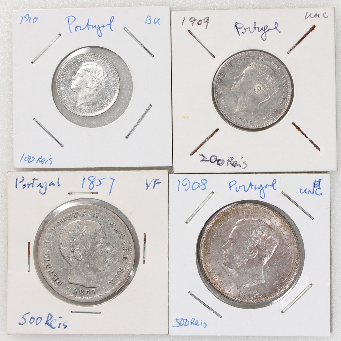 Portugal, group of 4 silver, consisting of 100 reis, 1910, 200 reis, 1909, 2x 500 reis, 1857 and 1908, the first three uncirculated, the fourth very fine (4), the first extremely fine, the rest about uncirculated to uncirculated (11);