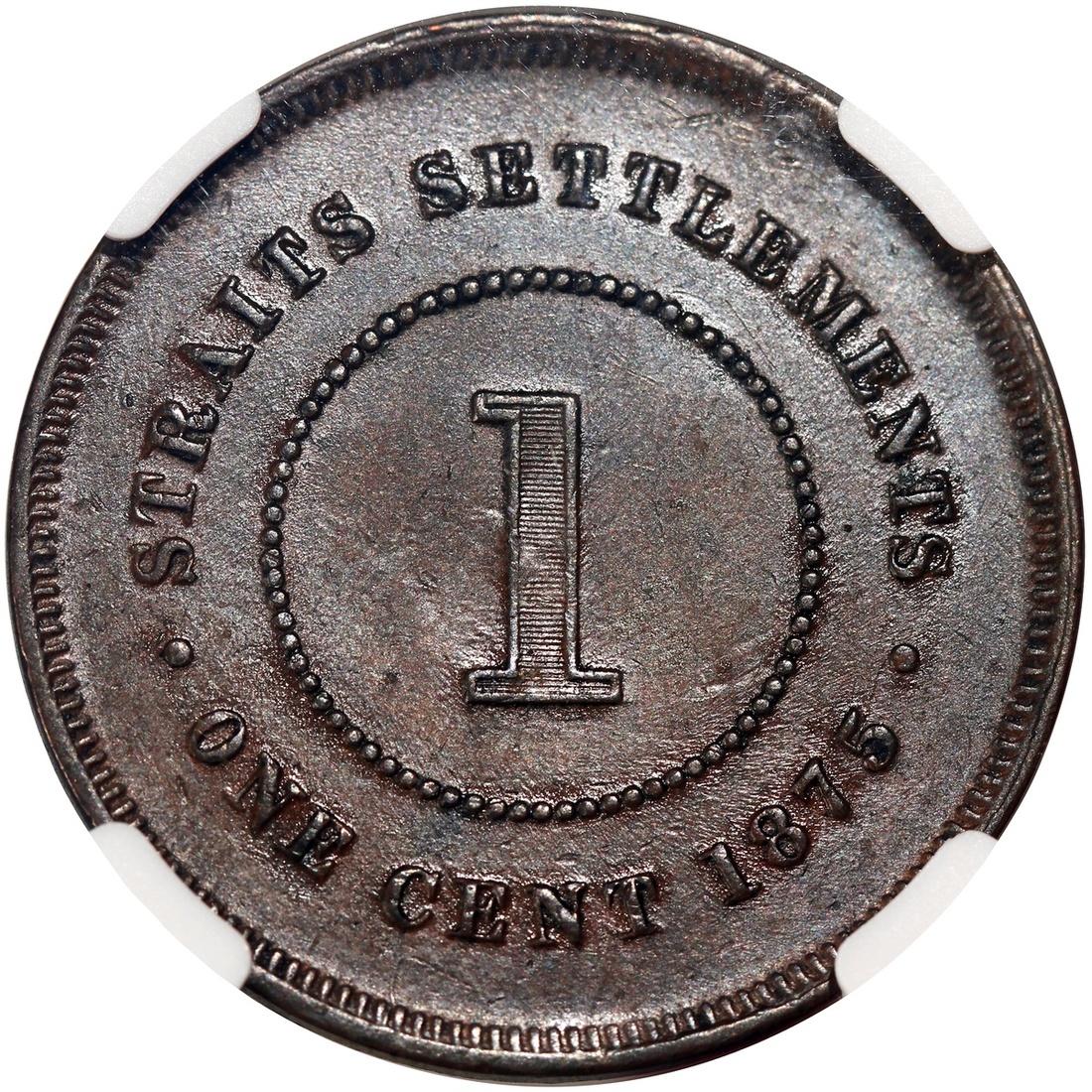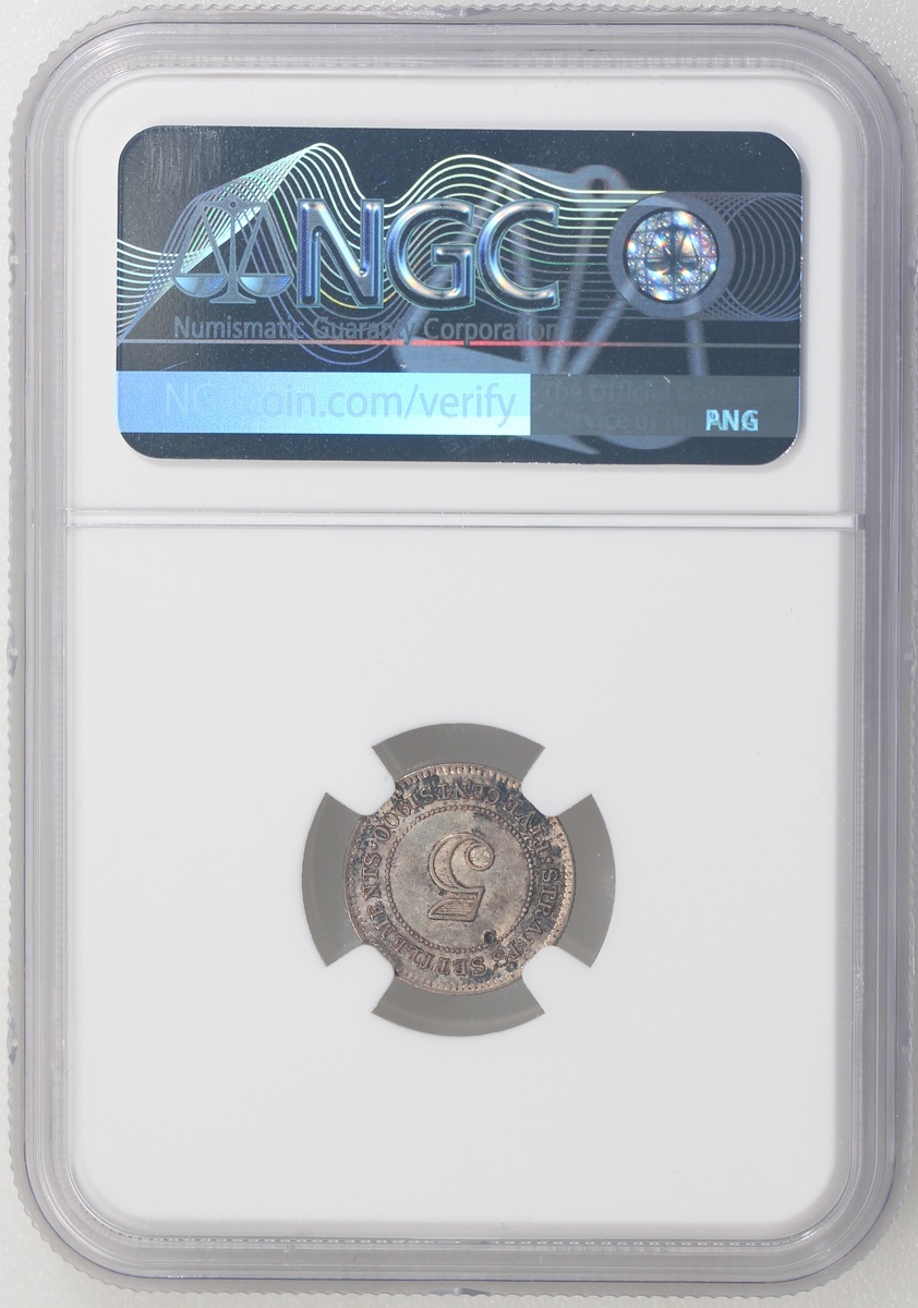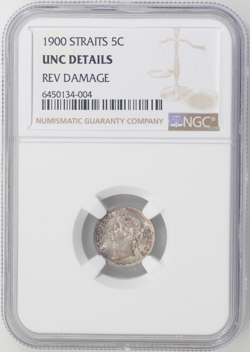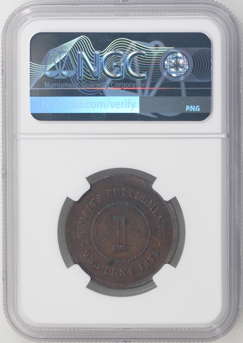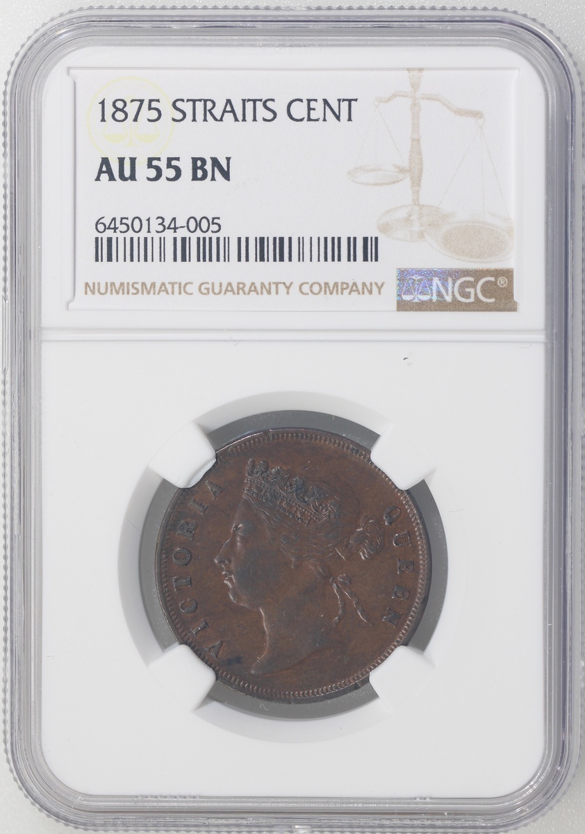 海峽殖民地1875年1仙銅幣及1900年5仙,以及香港1934年1仙銅幣及1933年1毫,分別NGC AU 55BN,#6450134-005,NGC UNC Details背面有損,及AU至UNC
