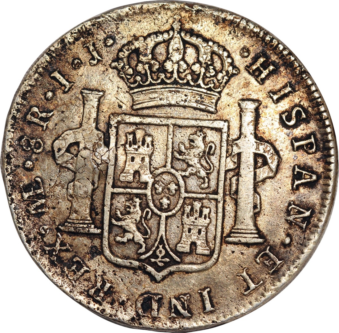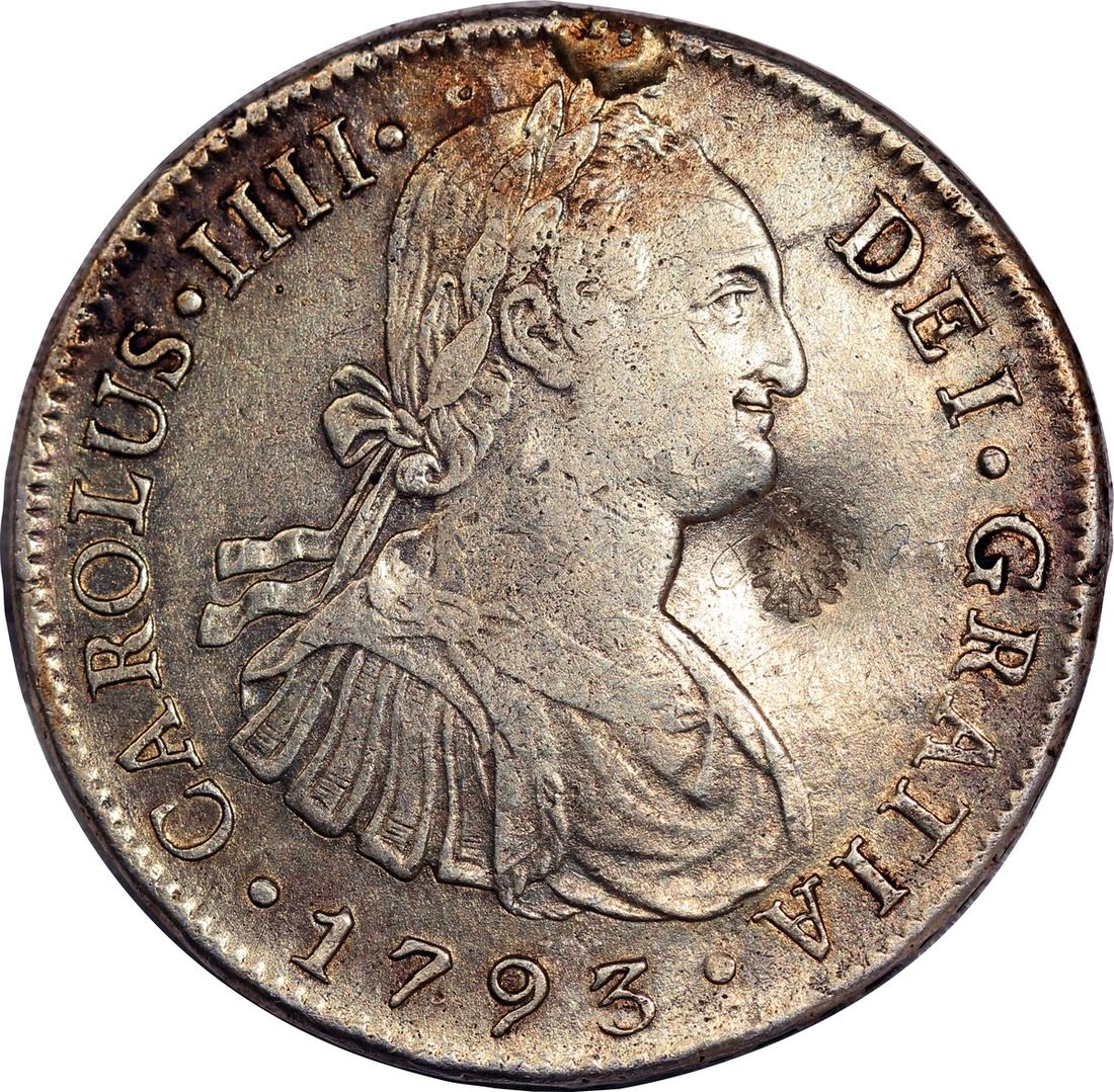 Sumatra, countermark coinage on a 1793 Peru 8 reales, sun burst chopmark at right of Charles IV,