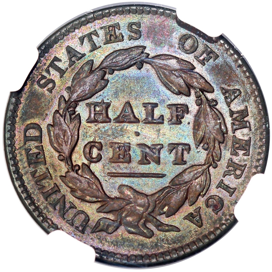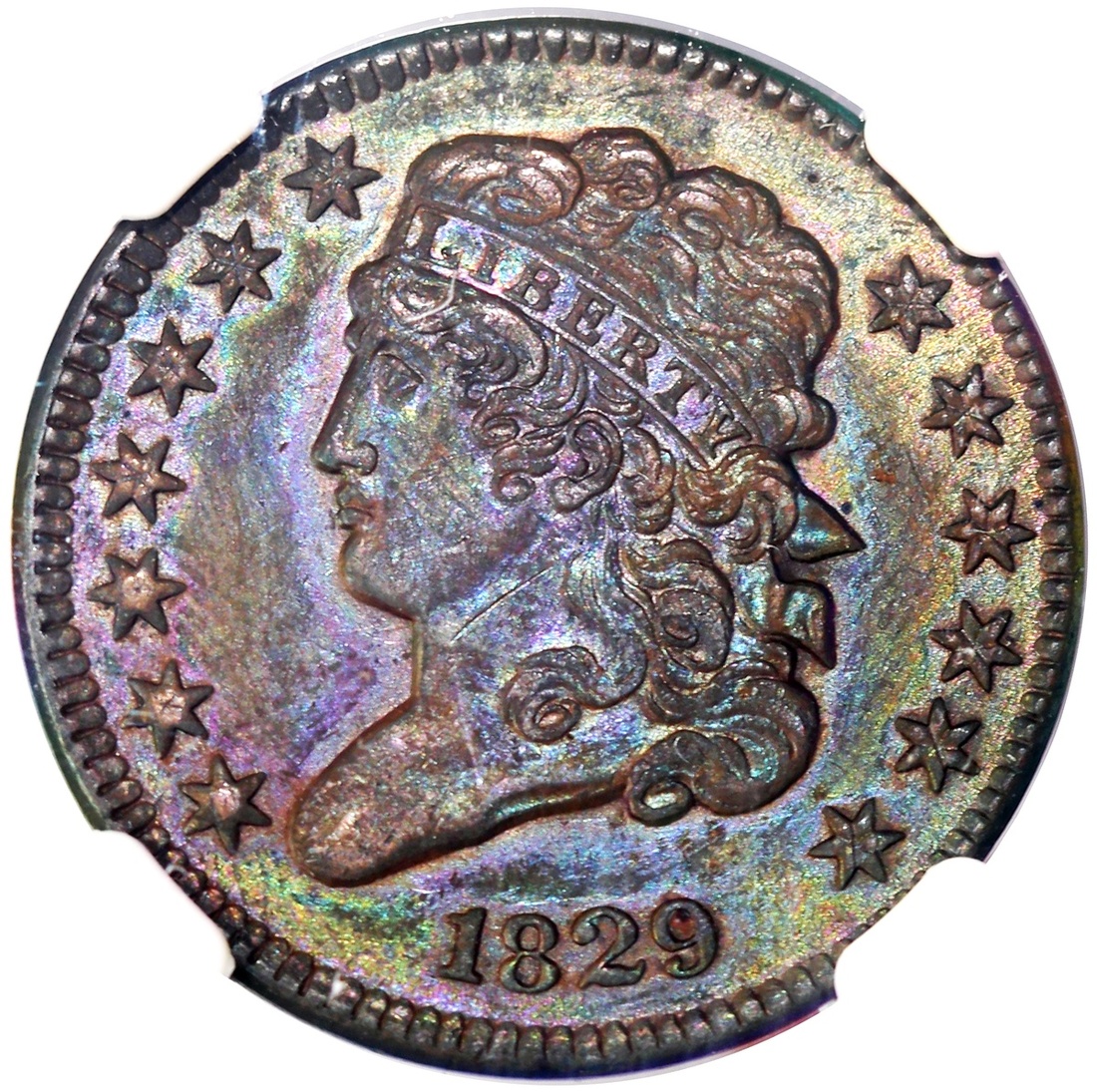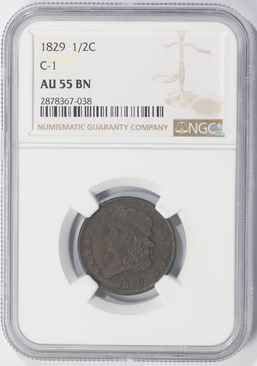 1829年美國1仙,NGC AU55BN,#2878367-038,棕調包漿,光線下隱約透出藍色虹彩,美品