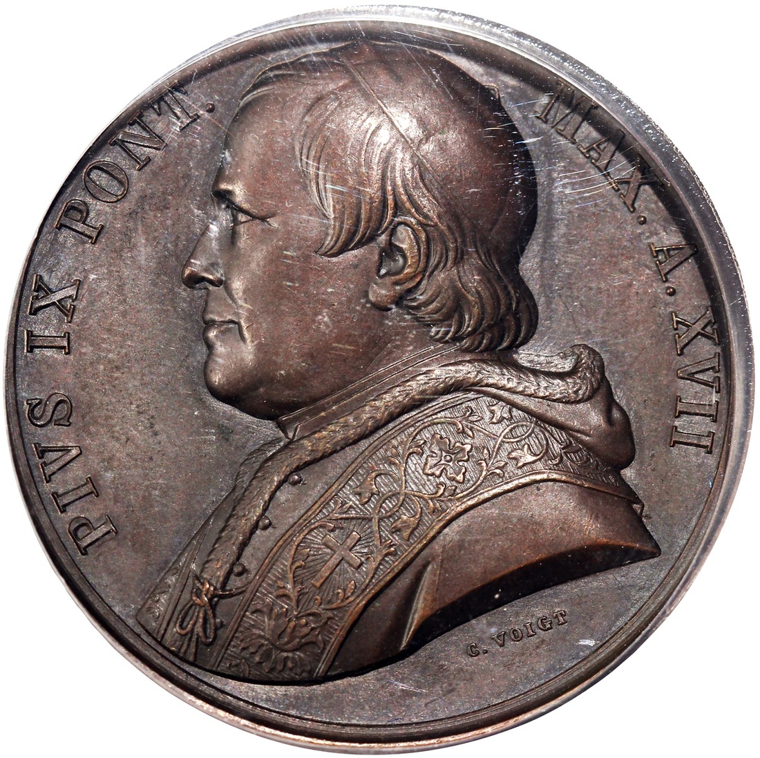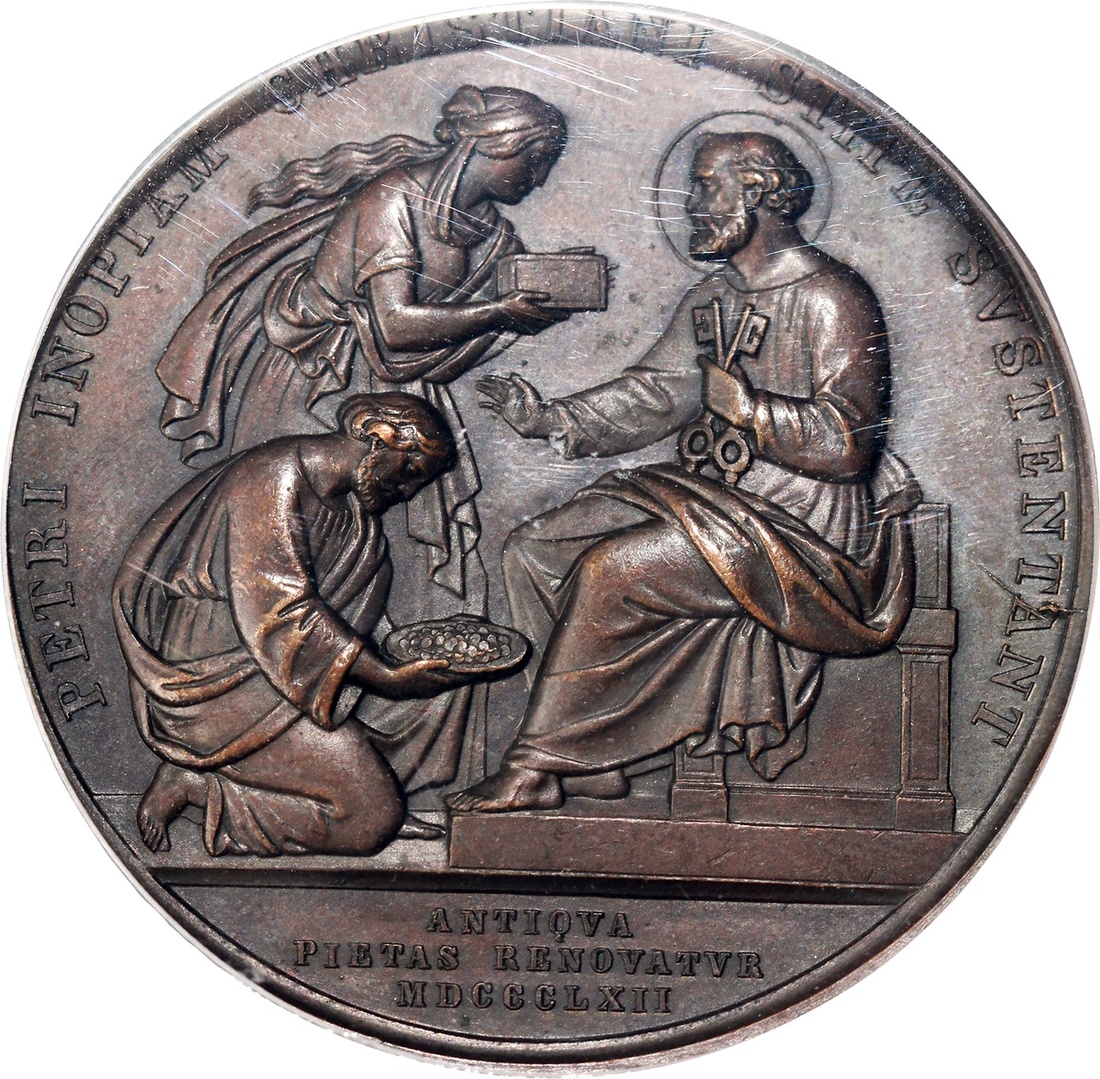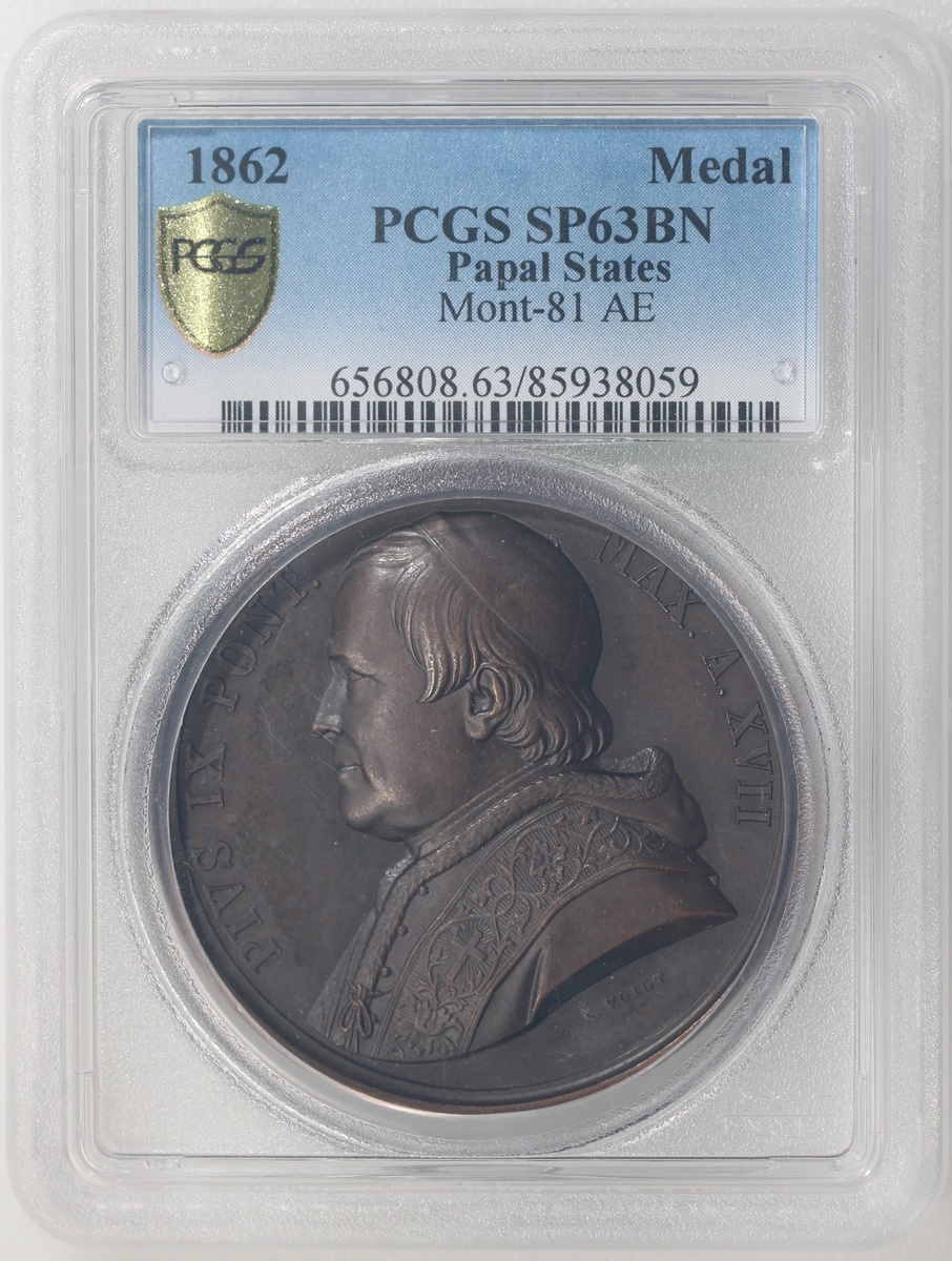 Papal States, specimen bronze medal, Anno XVII (1862), Pius IX on obverse, Saint Peter receiving gifts on reverse, PCGS SP63BN, Cert. #85938059. Highest graded coin in the PCGS population report as of writing