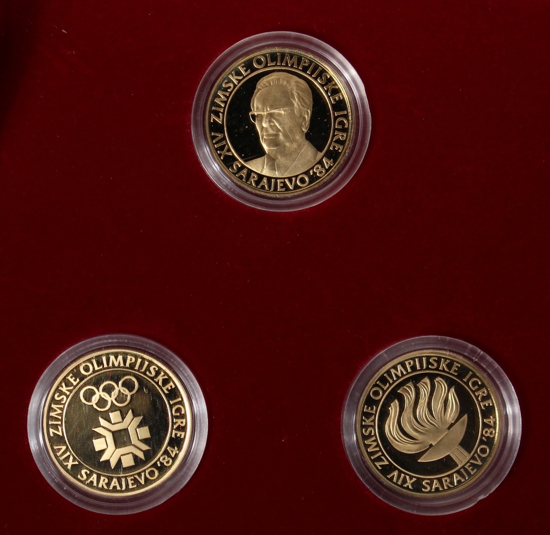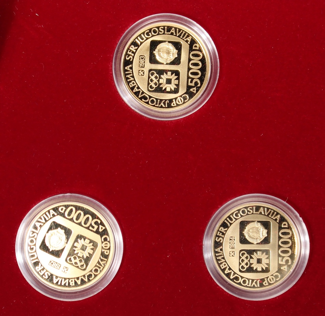 Yugoslavia, a set of 3x gold proof 5000 dinara, 1984, commemorative issue for the Winter Olympics, each weighs 8g containing .900 gold, AGW 21.6g (0.69oz),