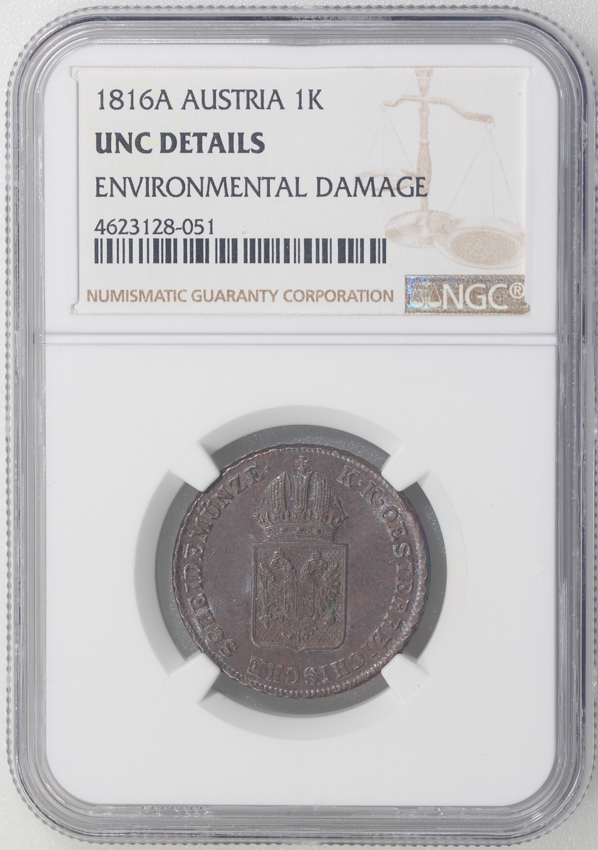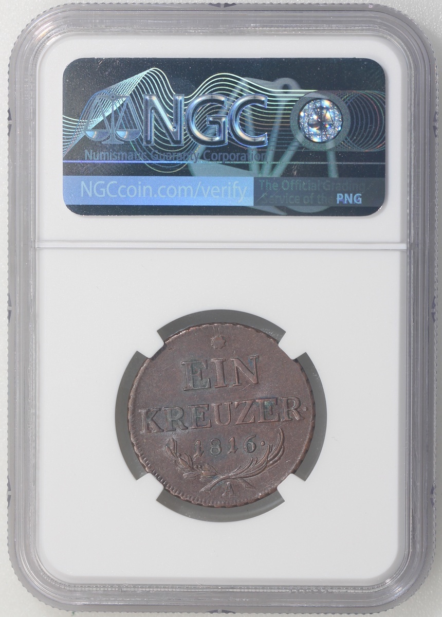 World Coins, a pair of copper coins, consists of Austria, 1 kreuzer, 1816A, and Belgian Congo, 5 centimes, 1888/7, graded NGC UNC Details (Environmental Damage) and AU Details (Cleaned) respectively, #4623128-051 and #4623128-043 (2).