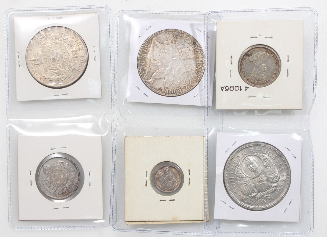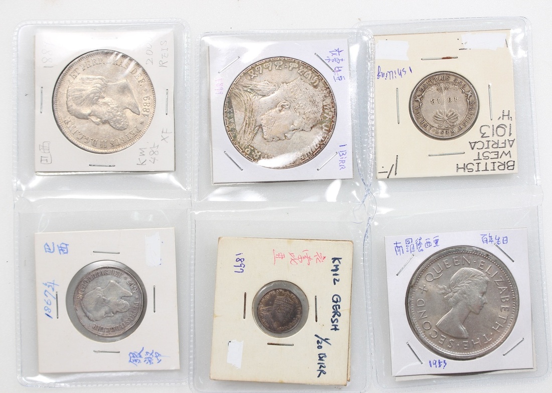世界銀幣6枚一組,包括巴西1867年500雷爾及1889年2000雷爾,英屬西非1913年1先令,埃塞俄比亞1899年1/20 Birr及1 Birr,以及羅德西亞1953年5先令,大致VF至EF,埃塞俄比亞1/20 Birr目測UNC,美品