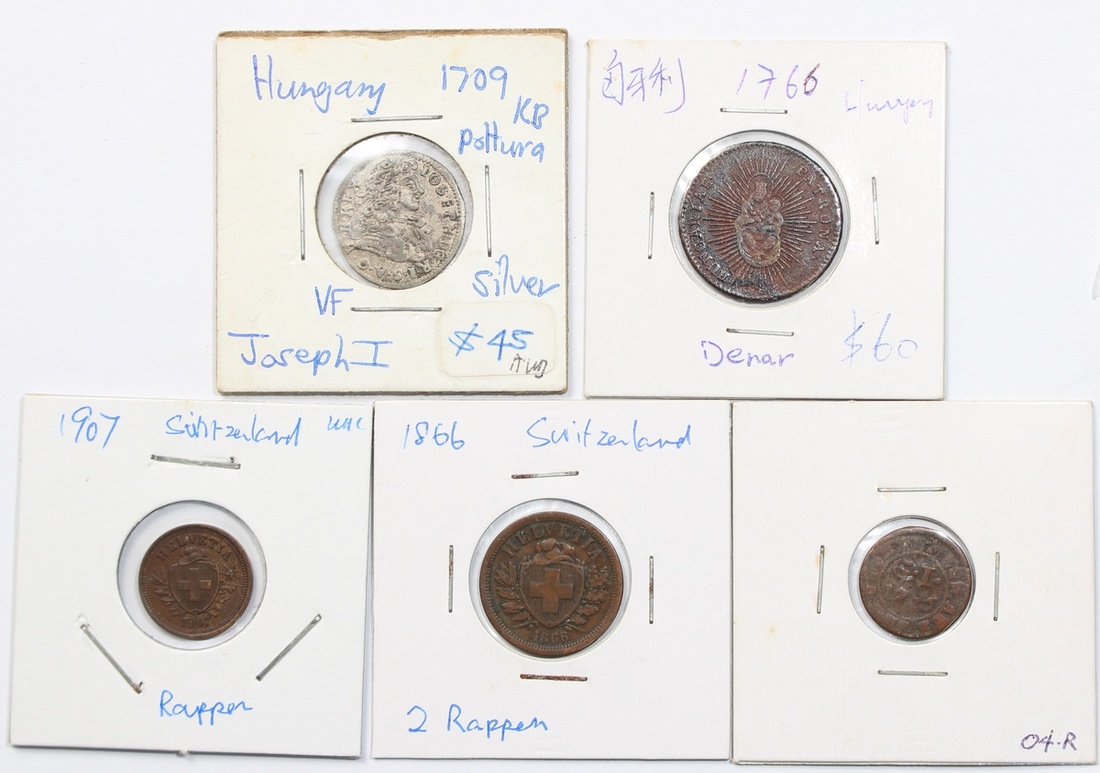 Malta, copper 1 grano, 1785, mixed condition, the Hungary coins very fine to extremely fine, the Switzerland coins about uncirculated, the Malta coin about fine and is a better type (5);