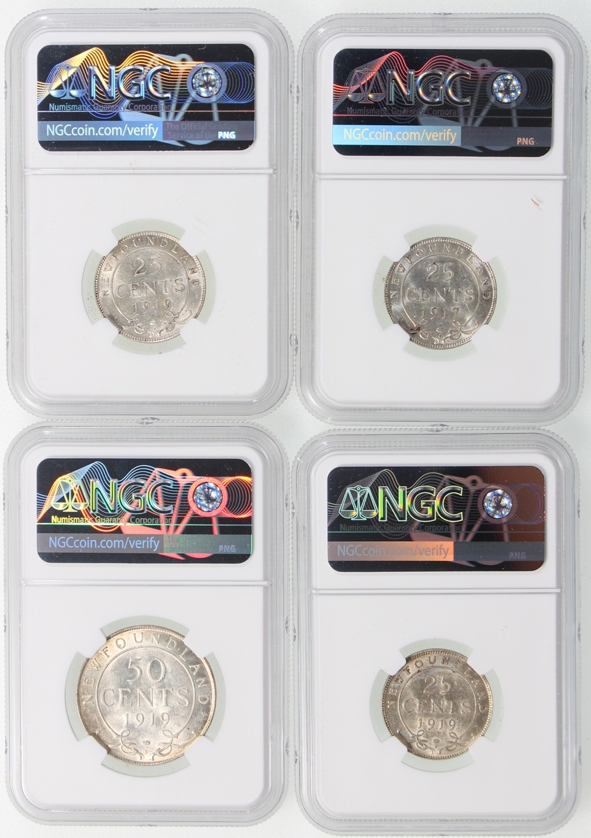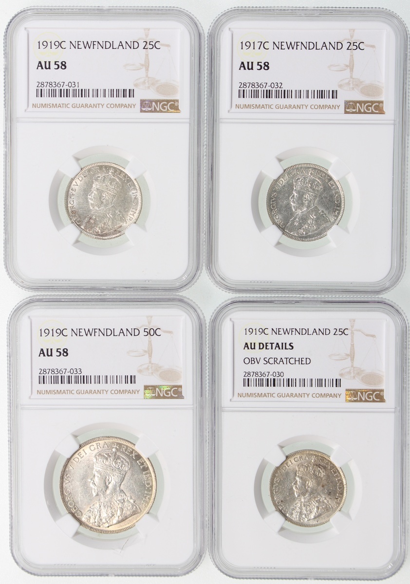 World Mixed Lot, Canada: Newfoundland, group of 4 silver coins, 25 cents: 1917-C, 1919-C (2), 50 cents: 1919-C, graded NGC AU58, AU Details (Obverse Scratched), AU58 and AU58 respectively (4);