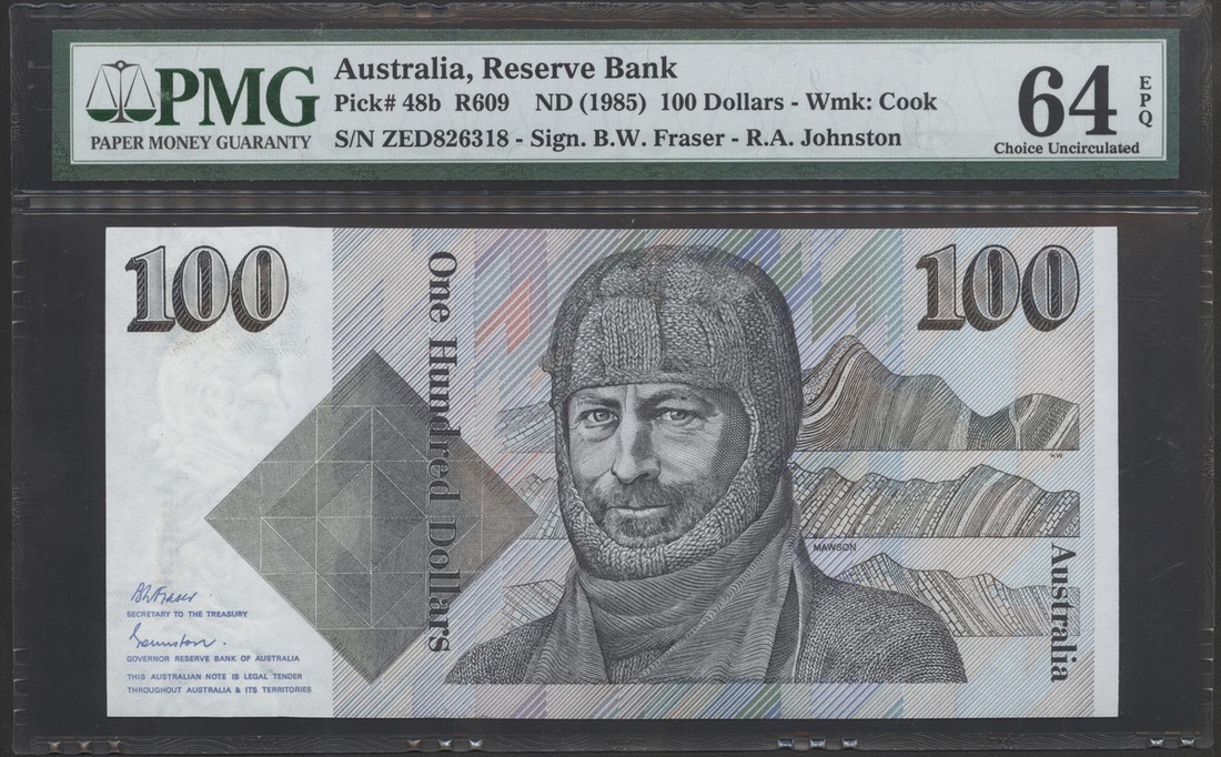 Reserve Bank of Australia, 100 Dollars, ND(1985), serial number ZED826318, black and grey, Mawson at centre, (Pick 48b), PMG 64EPQ Choice Uncirculated