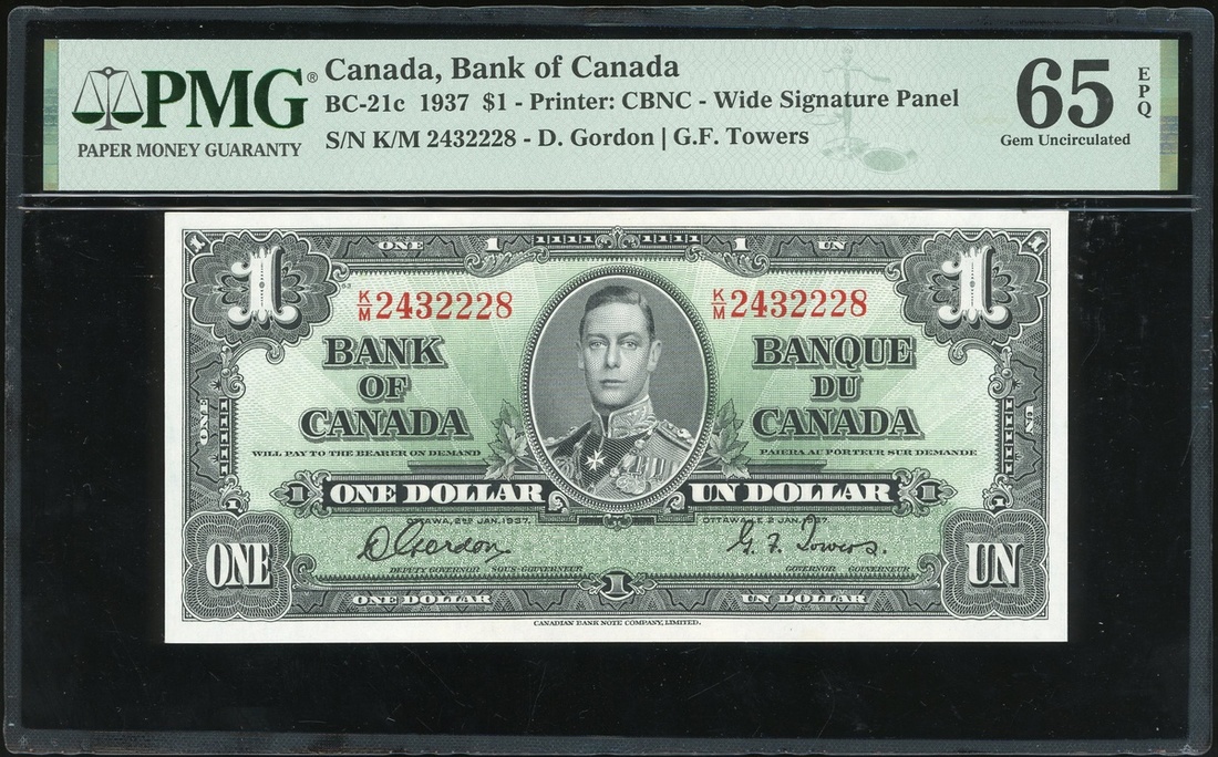 1937年加拿大1元,編號K/M 2432228,PMG 65EPQ