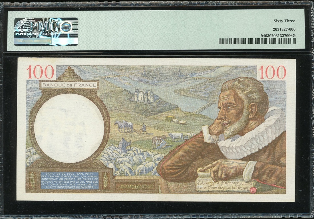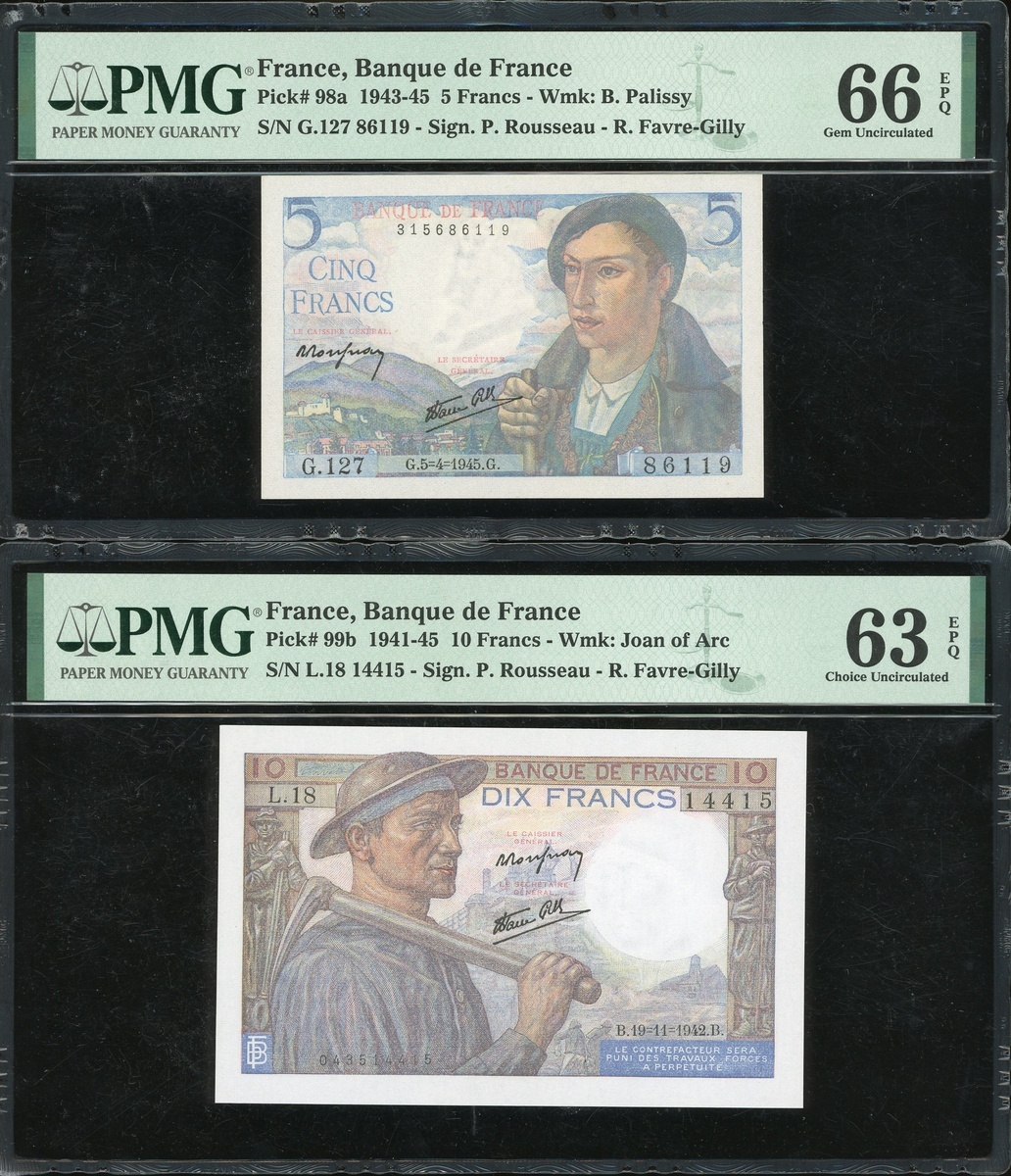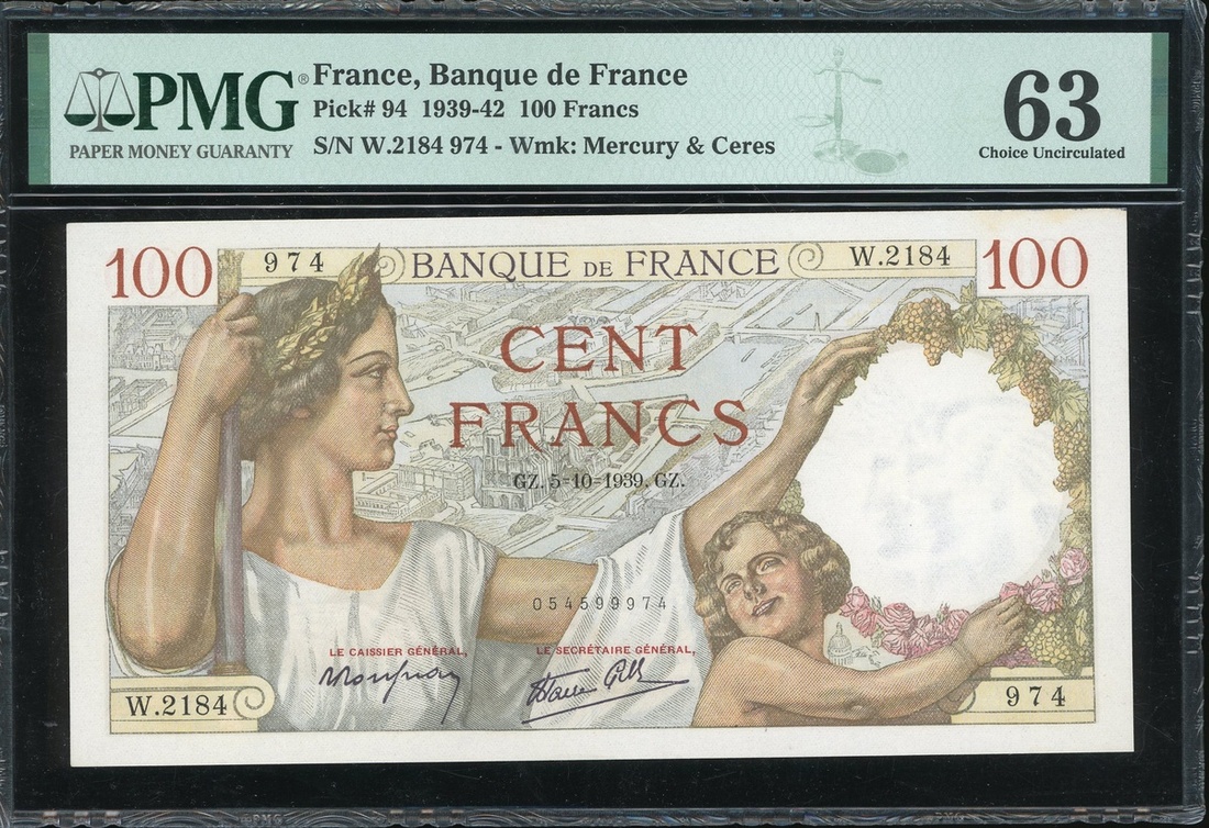 France, Banque de France, a group of 3 notes, consists of 5 francs, 1945, 10 francs, 1942, and 100 francs, 1939, serial numbers G. 127 86119, L.18 14415 and W.2184974, (Pick 98a, 99b and 94), graded PMG 66EPQ, 63EPQ and 63EPQ respectively (3).