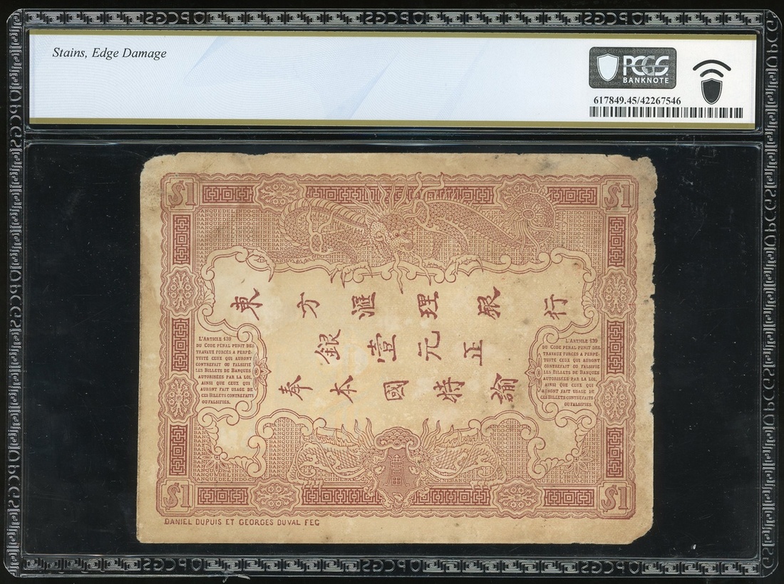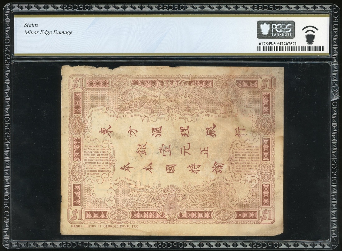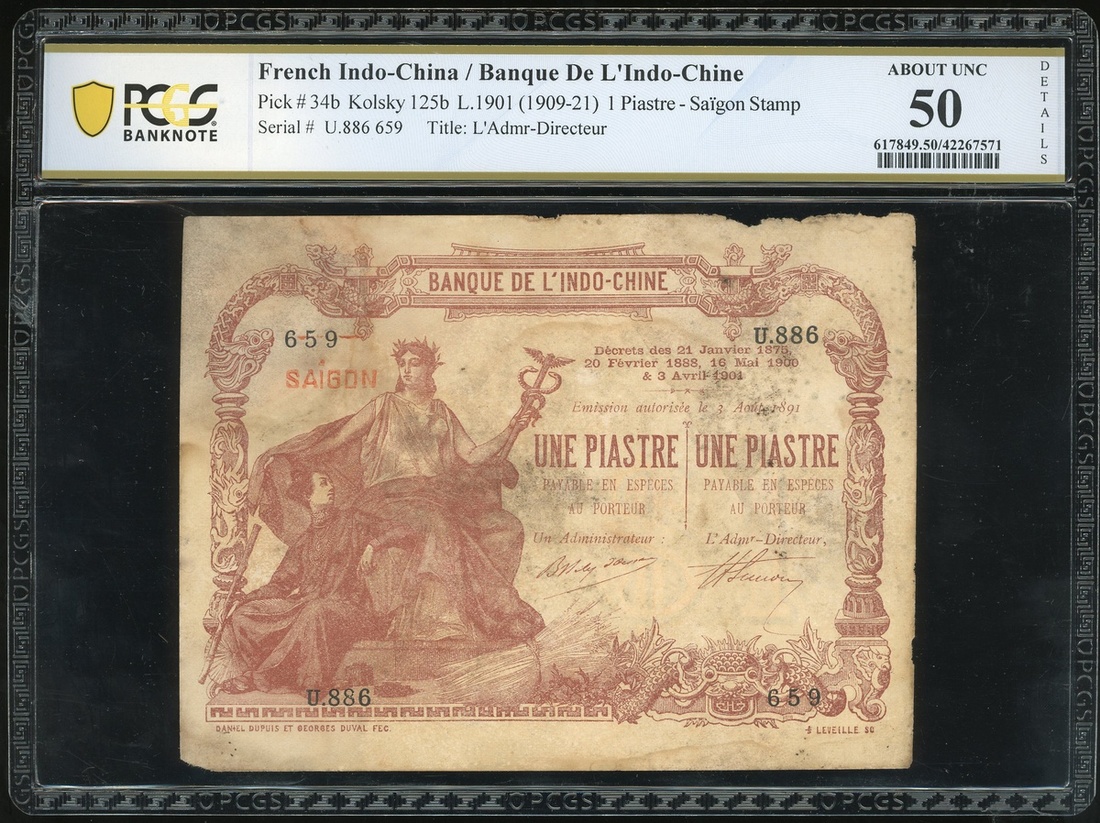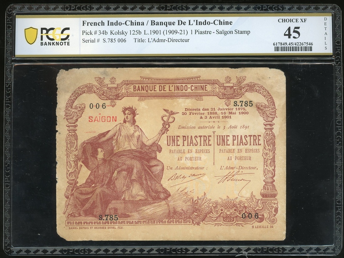 1901年法屬安南1元,西貢地名,編號 S.785 006和U.886 659,分別PCGS Banknote 45 和50