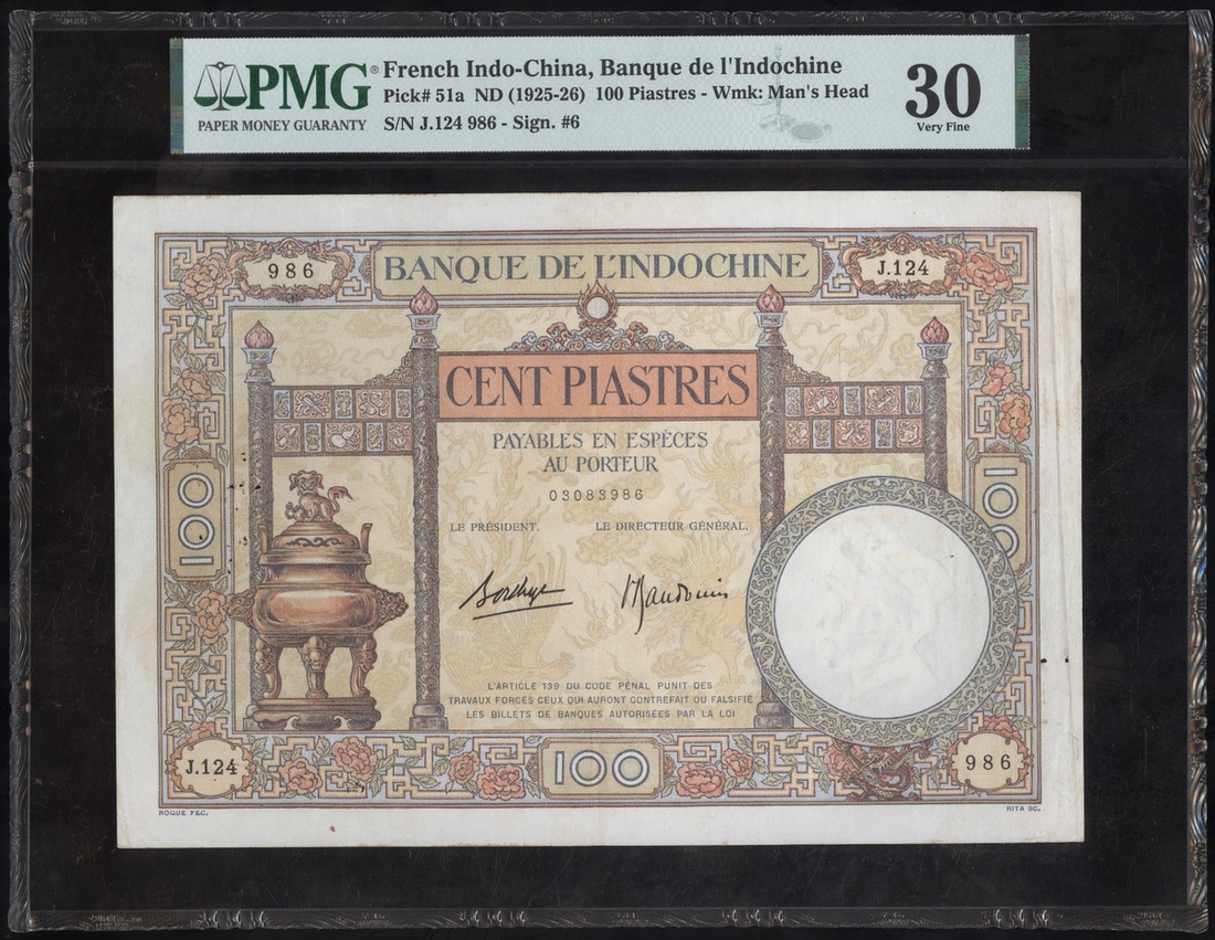 無日期(1925-26)法屬安南100元,編號J124 986,PMG 30