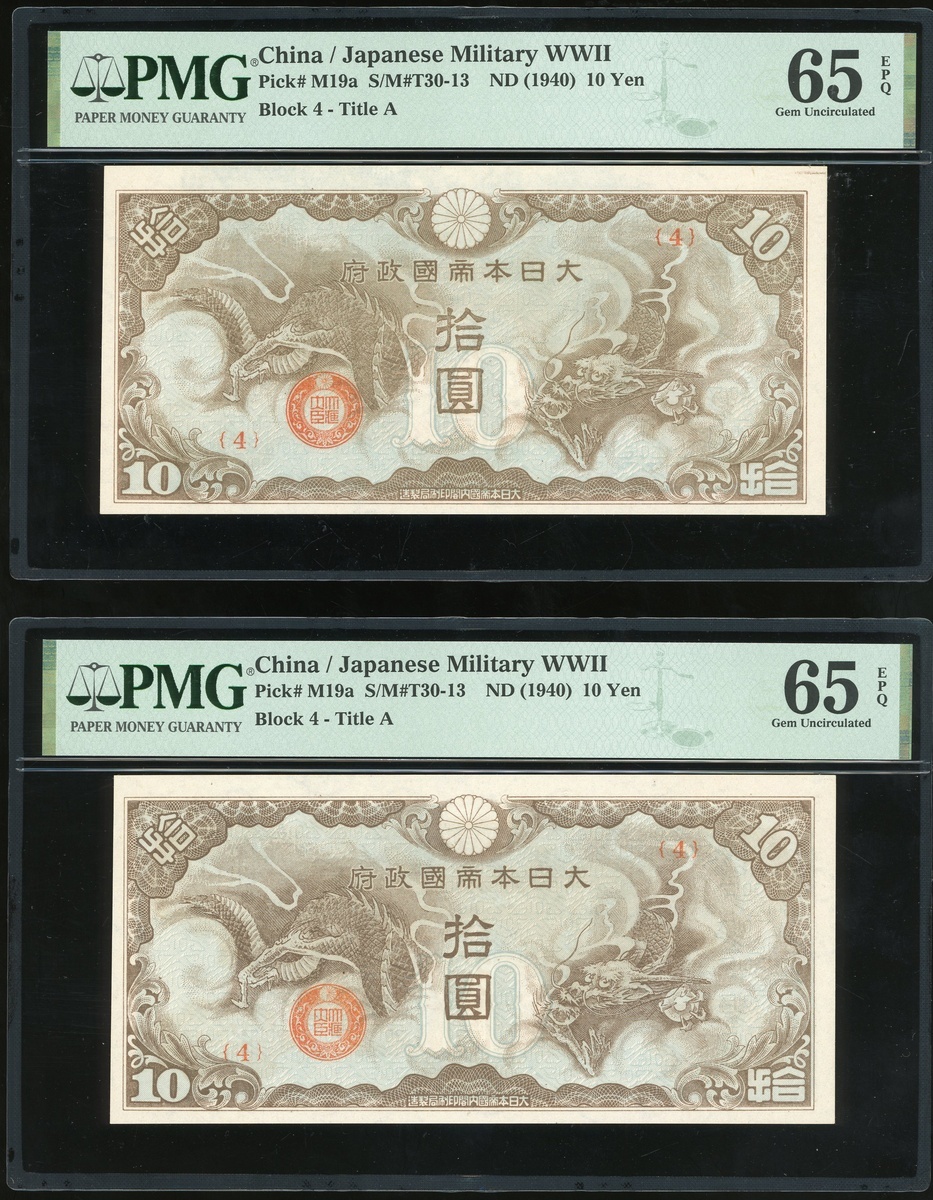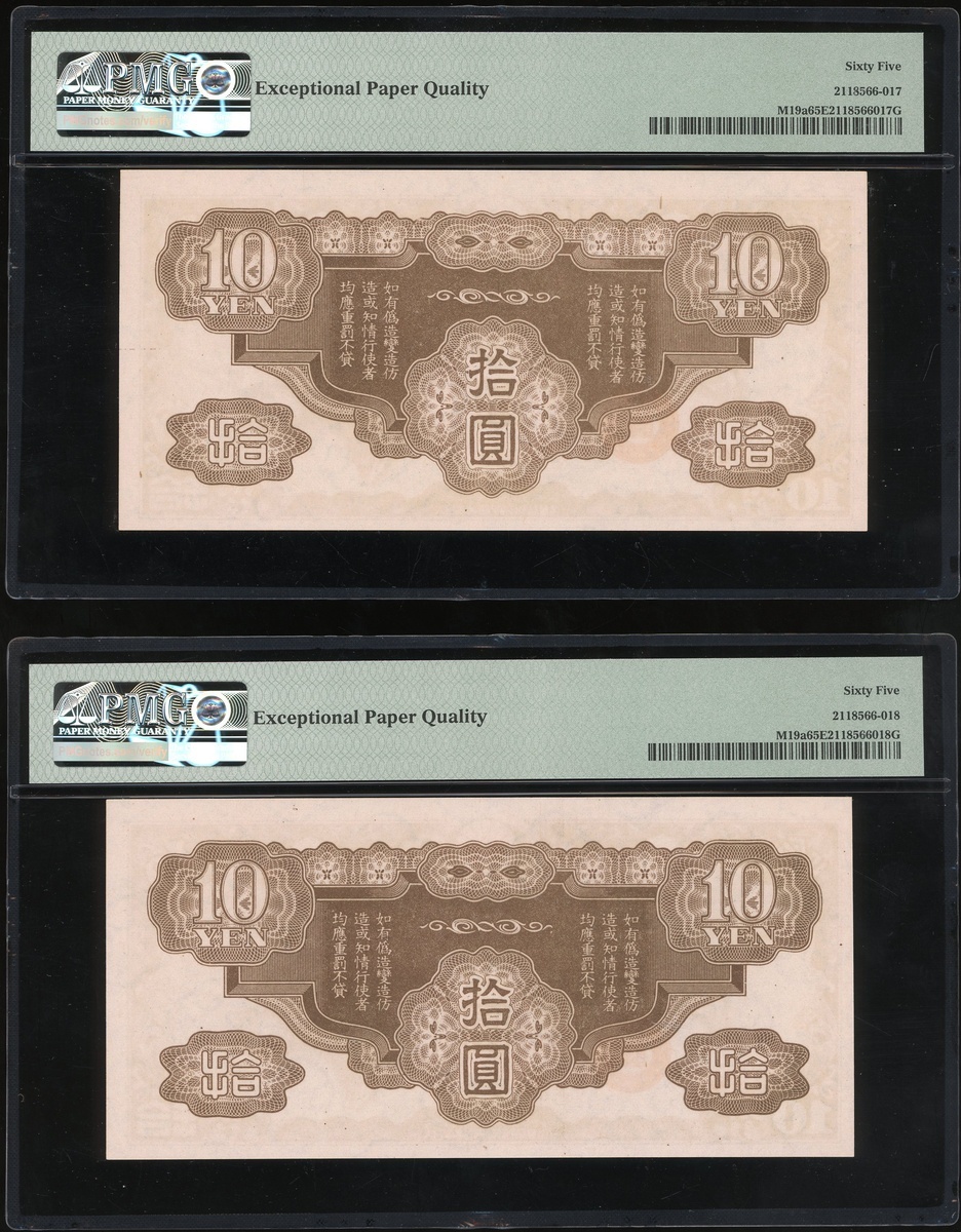French Indochina: Japanese Invasion Money, a pair of 10 yen, ND (1940), #Block 4, (Pick M7), both graded PMG 65EPQ Gem Uncirculated. Inaccurate information on the PMG label (2)
