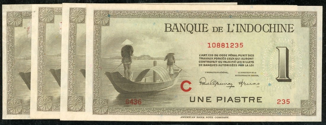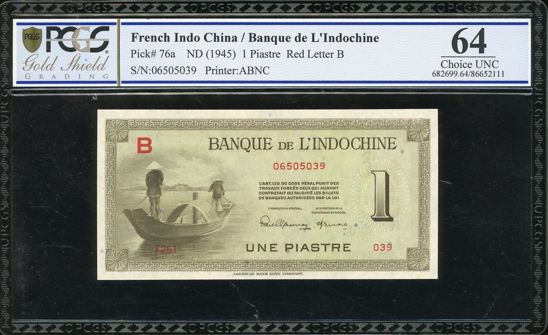 French Indo China, group of 5x 1 paistre, 1945, (Pick 76a), 1 note graded PCGS Gold Shield 64, the rest about extremely fine to almost uncirculated (5)