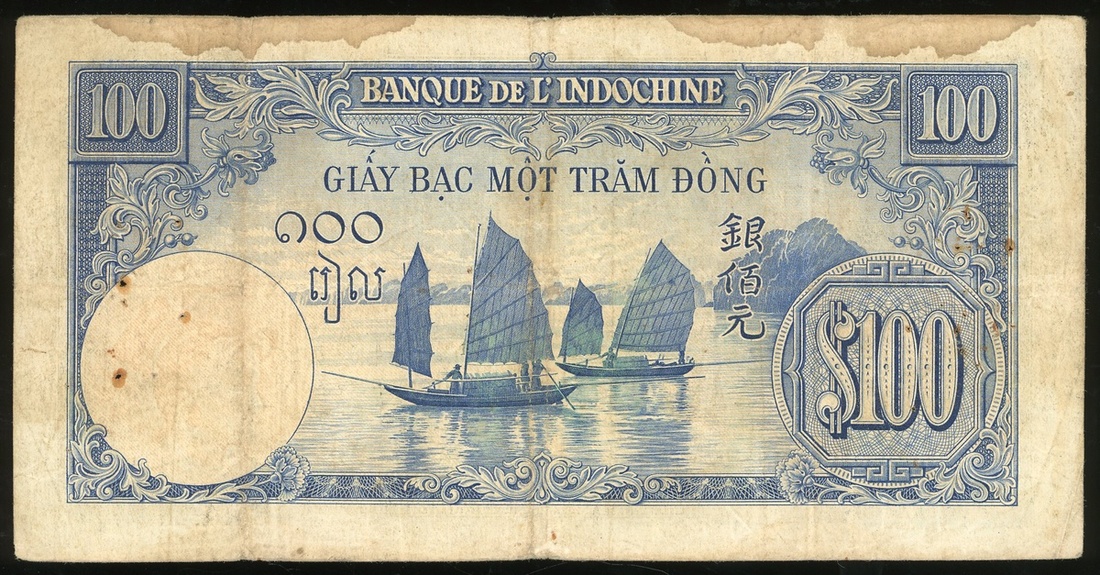 French Indo China: Banque de L'indochine, 100 piastres, ND(1946), serial number Y226 0276, (Pick 79), about fine with water stains and a few minor rusty pinholes