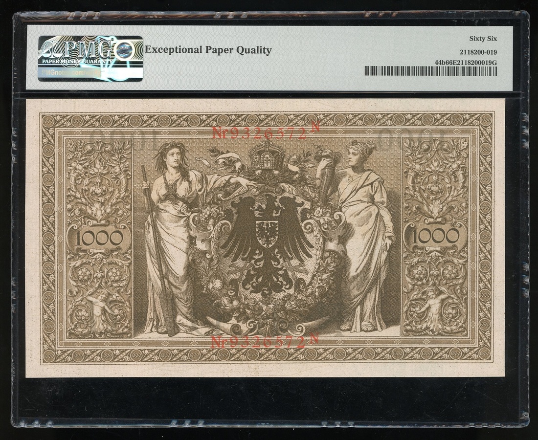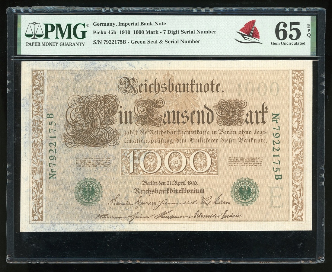 Germany, group of 5 Imperial Bank Notes: 1x 100 mark, 1908, serial number 0353505, 4x 1000 mark, 1910, two sets of consecutive serial numbers 7922175B, 7922176B, 9326571N, 9326572N, (Pick 33a, 45b, 44b), 3 notes graded 65EPQ Gem Uncirculated, 2 notes graded 66EPQ Gem Uncirculated (5)