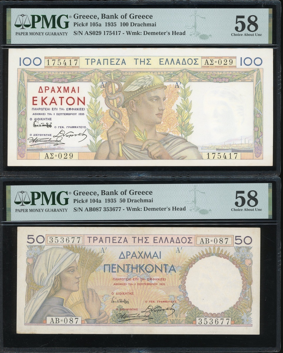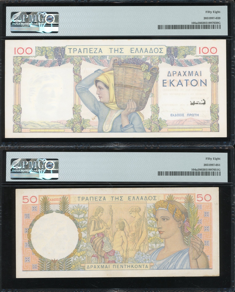 無日期希臘50和100德拉克馬,編號AB087 353677和AS029 175417,均PMG 58