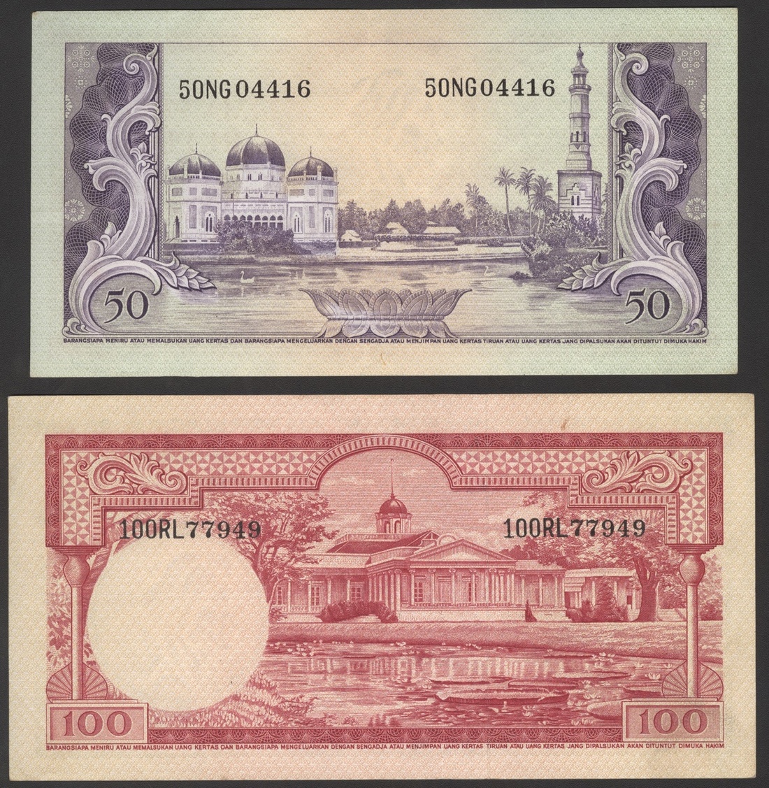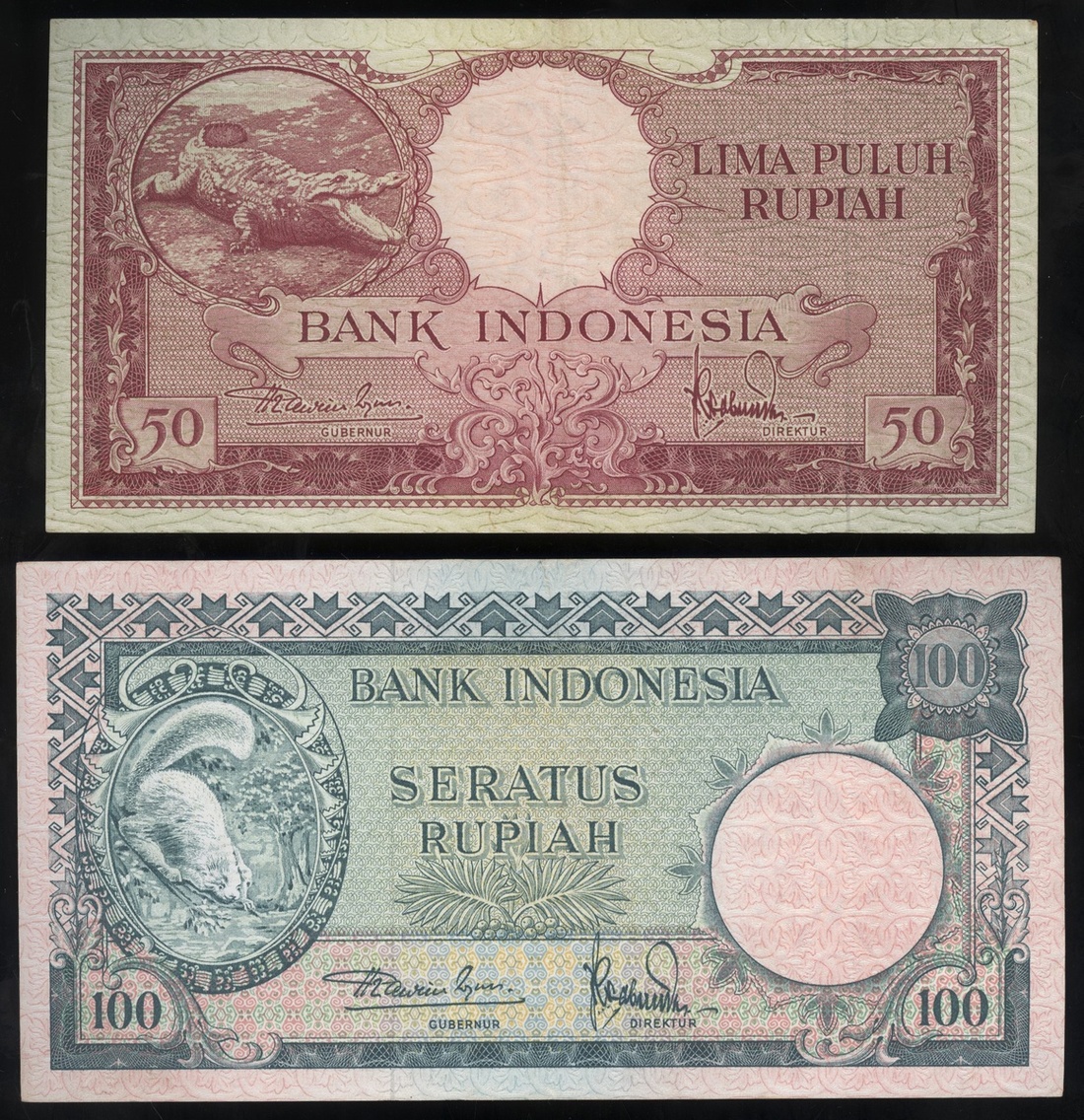 Bank Indonesia, 50 rupiah and 100 rupiah, ND (1957), serial numbers 50NG04416, 100RL77949, (Pick 50a, 51a), About XF to UNC condition, viewing recommended (2)