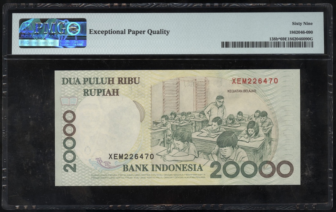 Bank Indonesia, 20000 rupiah, 1998, replacement serial XEM226470, (Pick 138b*), PMG 69EPQ Superb Gem Uncirculated, the highest graded of such note in the PMG population report! The only other note of the same grade is featured in the next lot