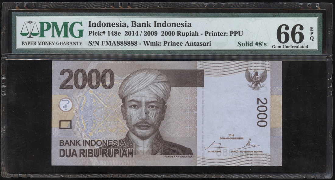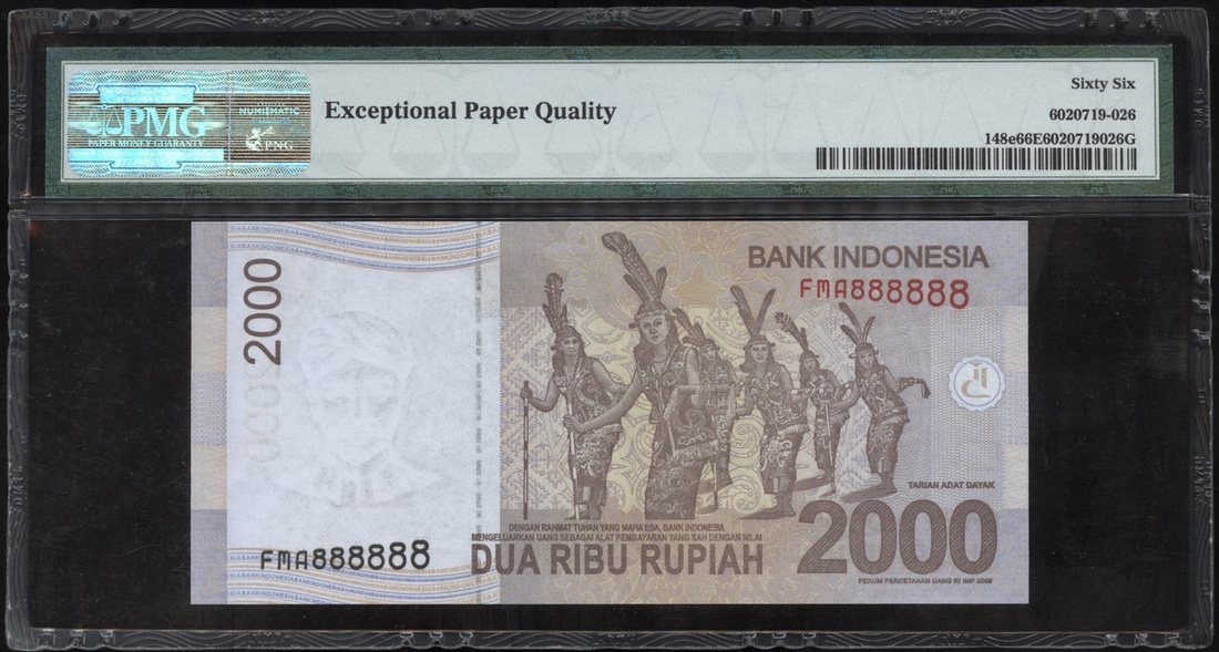 2009年印尼2000盾,編號FMA888888,PMG 66EPQ