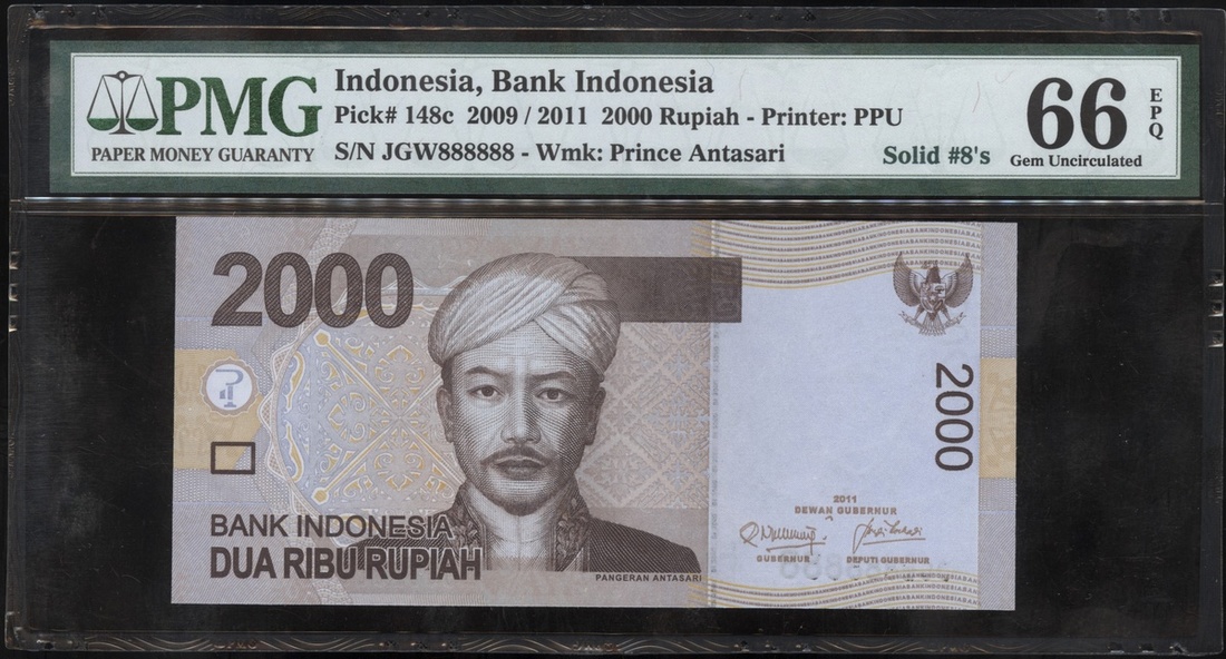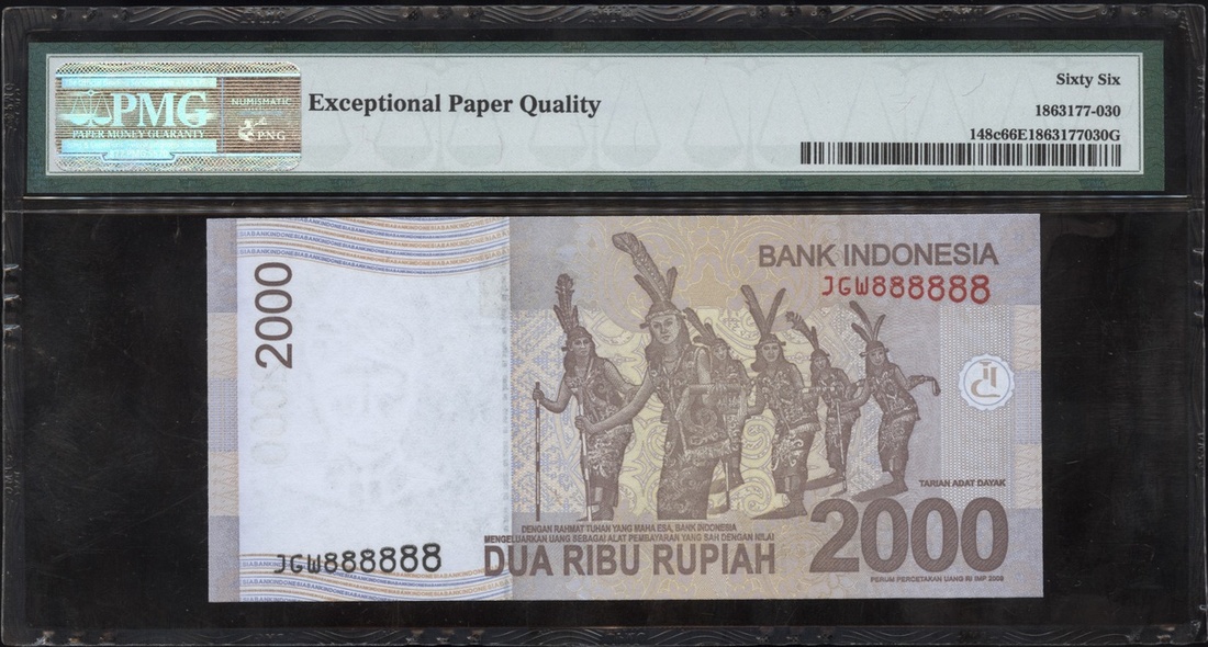 2009年印尼2000盾,編號JGW888888,PMG 66EPQ