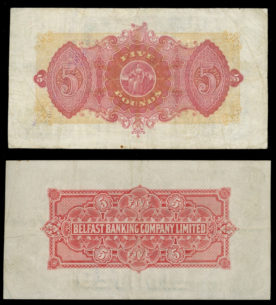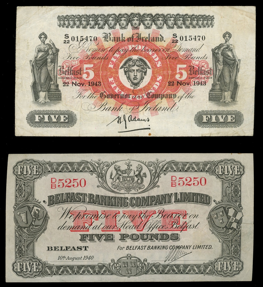 Northern Ireland, lot of 2x 5 pounds: Bank of Ireland, 22.11.1943 #S22 015470 and Belfast Banking Company Limited, 10.8.1940 $DB 5250,