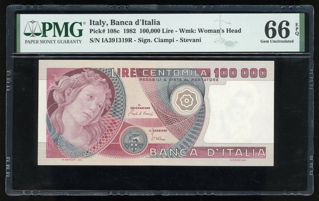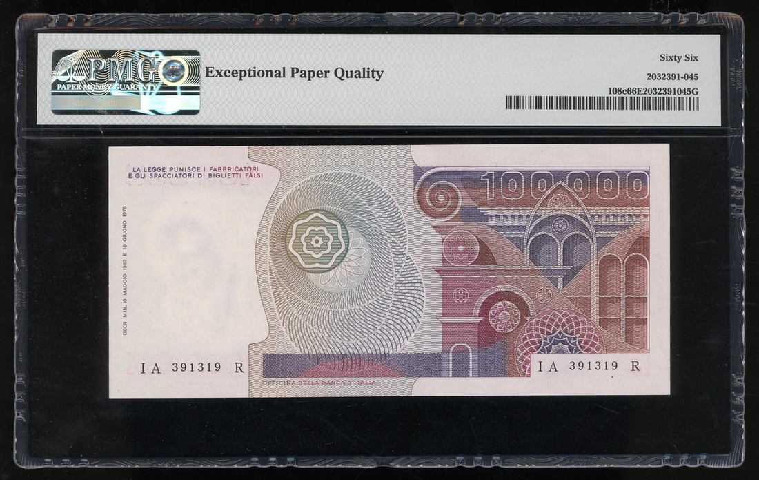 1982年義大利100000里拉,編號IA 391319R,PMG 66EPQ