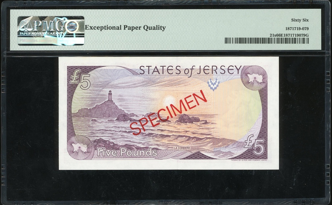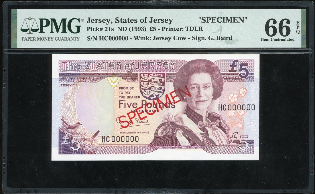 無日期(1993)澤西島5鎊樣票,編號HC000000,PMG 66EPQ