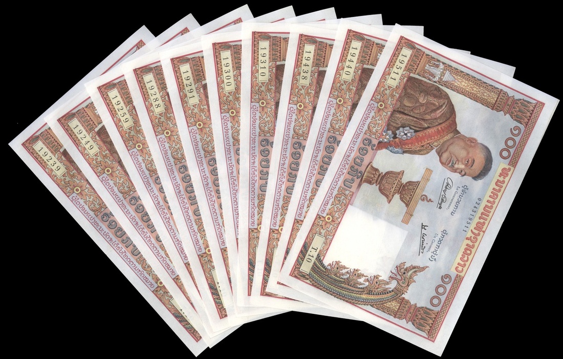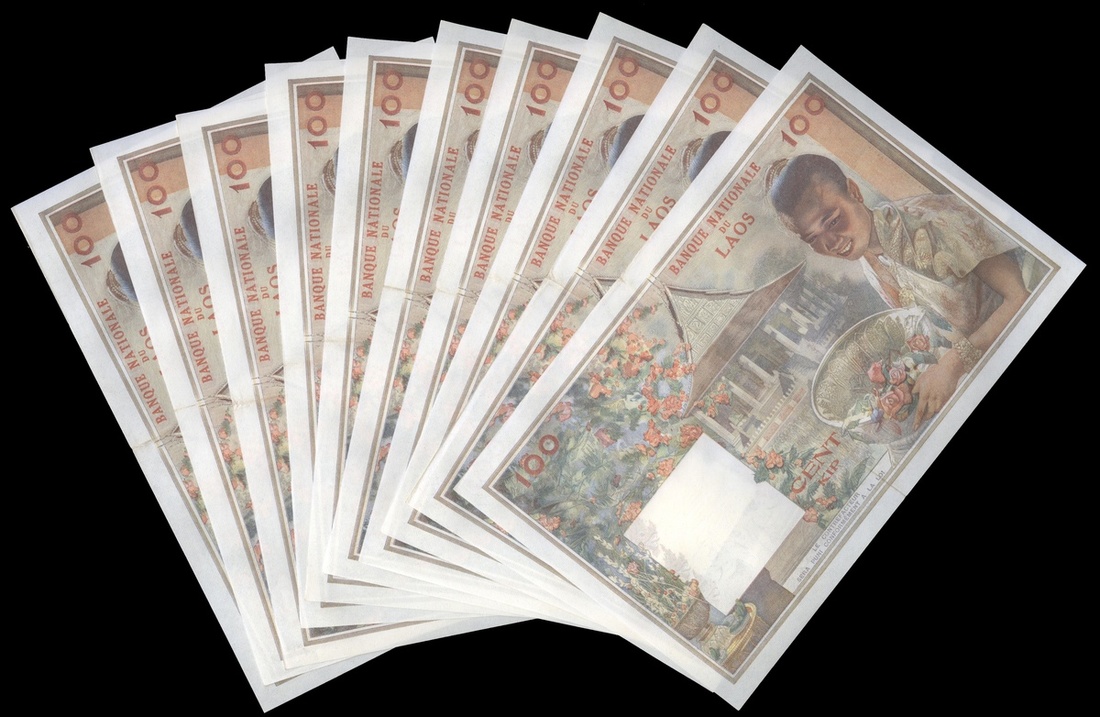 lot of 10 100 Kip, ND(1957), reddish-brown and multicoloured, King Sisavang Vong at left, reverse Ho Phra Keo temple,