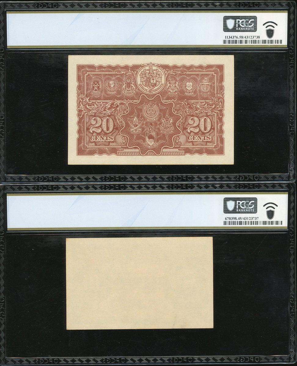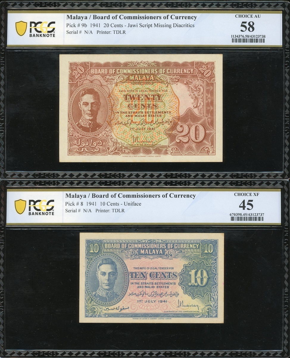 Malaya, Board of Commissioners of Currency, a pair of uniface obverse 10 cents and 20 cents, 1941, no serial number, 20 cents with Jawi script missing diacritics,