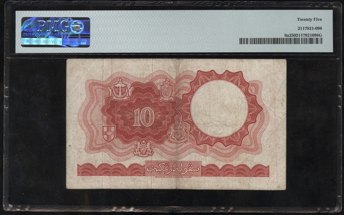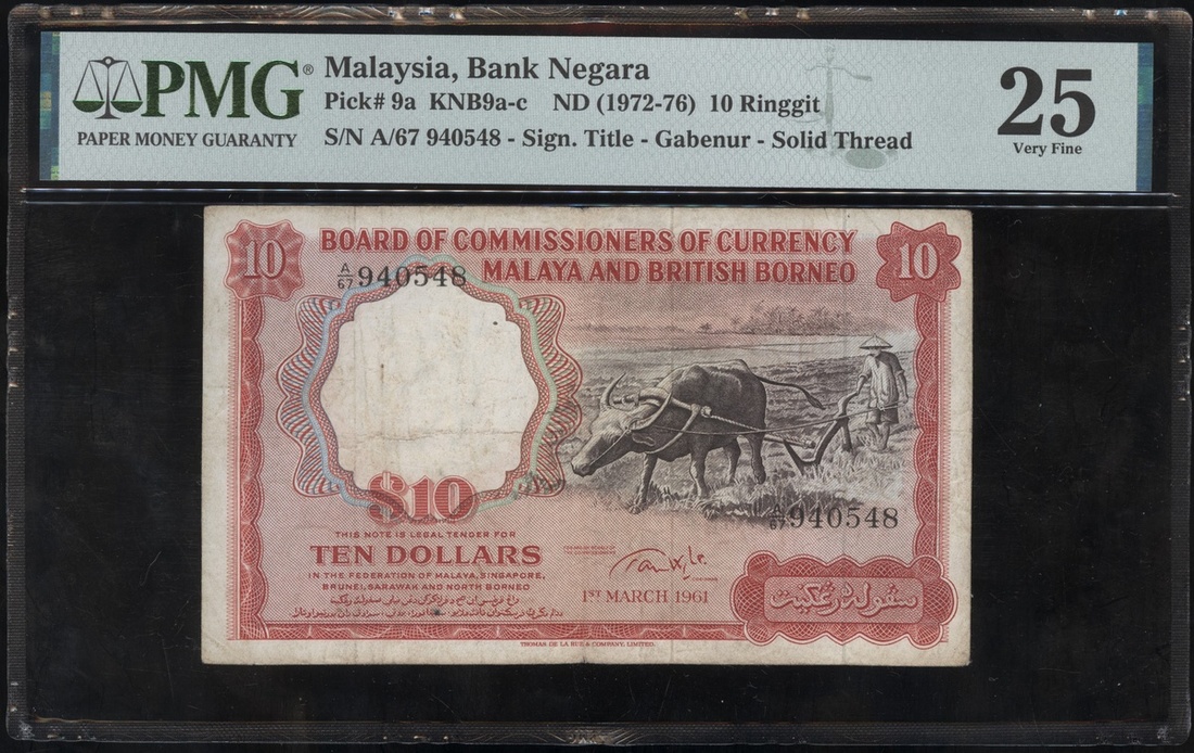 1961年馬來亞及婆羅洲10元,編號A/67 940548,PMG 25,PMG標籤上有錯
