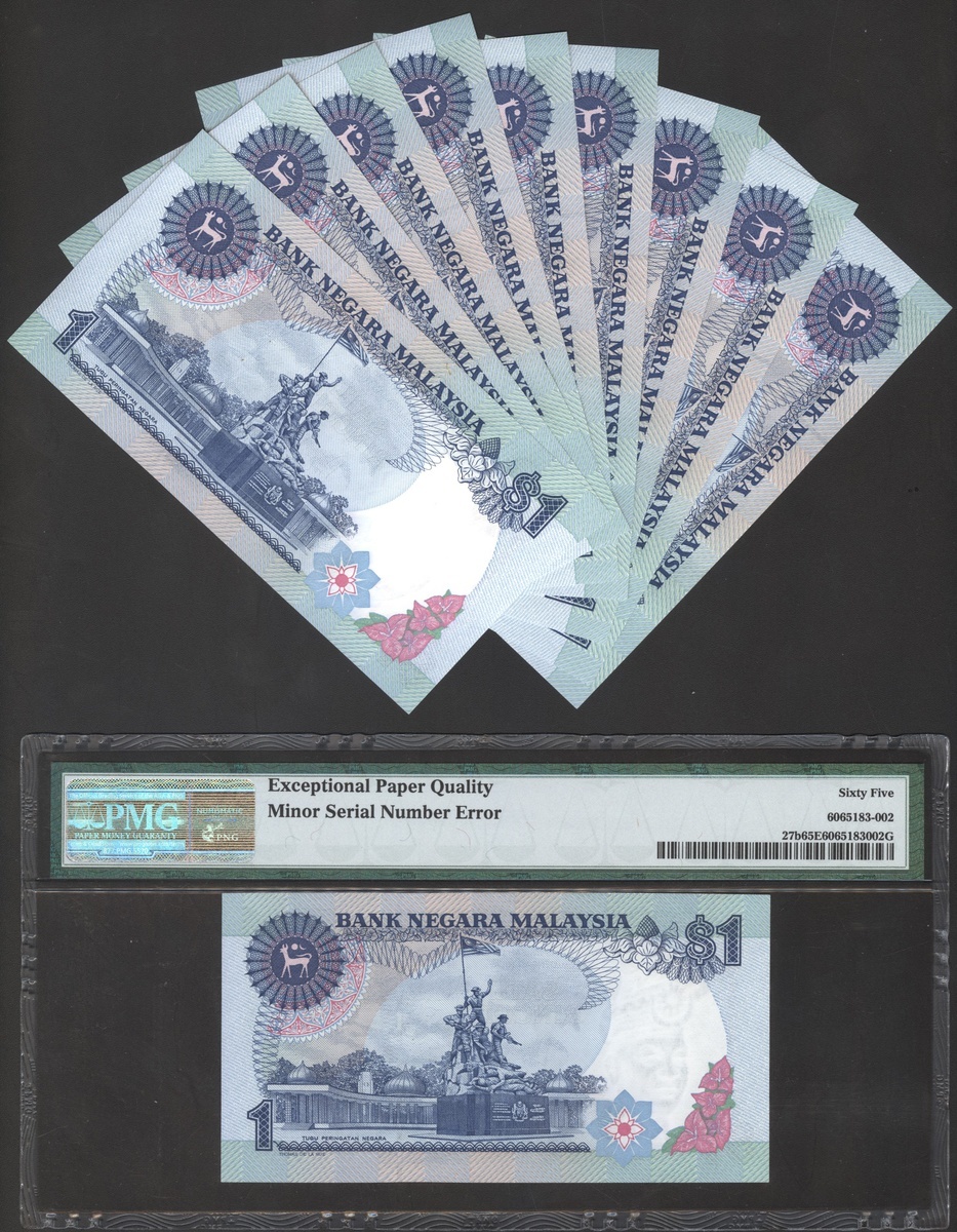 1981年馬來西亞第六版1令吉連號一組10枚, HA7335411-420,416評PMG,其餘均UNC