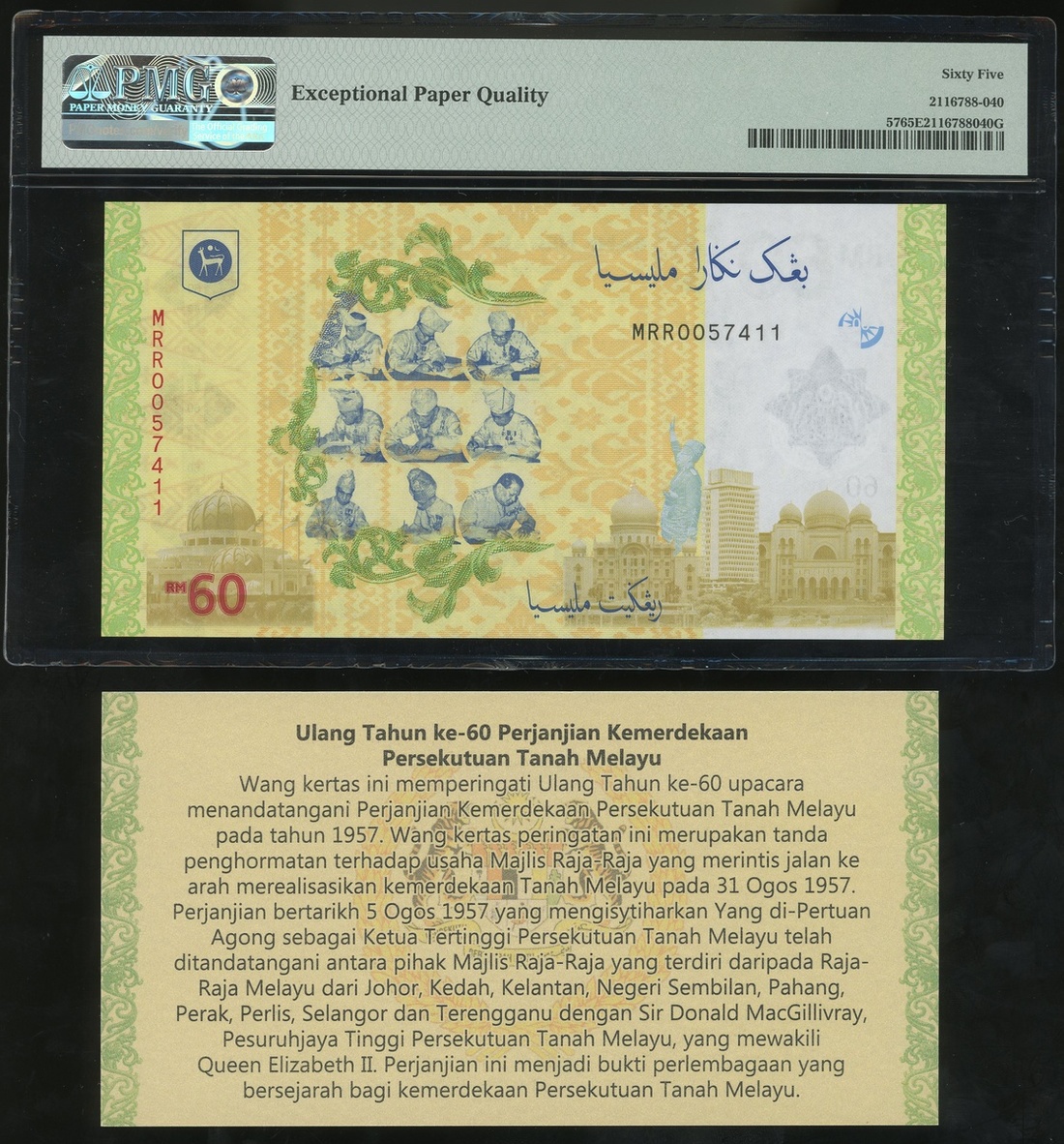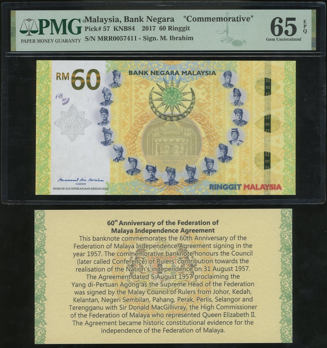 無日期(2017)馬來西亞60令吉紀念鈔,編號MRR0057411,PMG 65EPQ,連原裝黑套