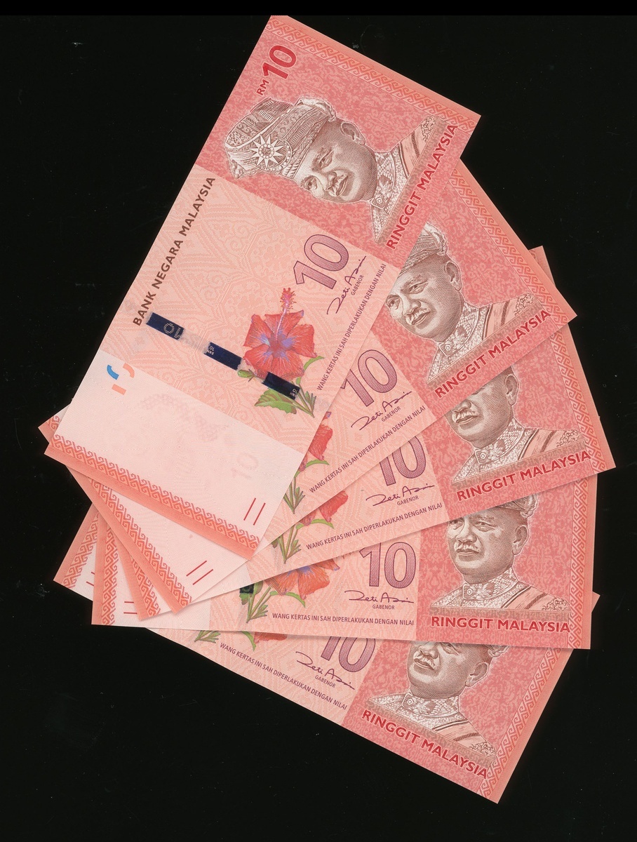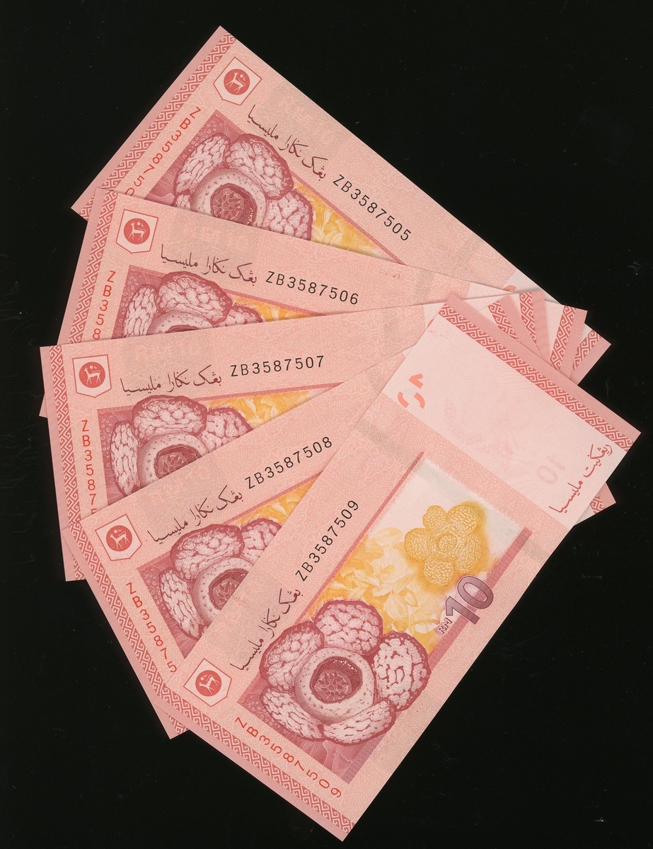 無日期馬來西亞10和20令吉補版鈔共9枚,編號ZB3587505-509 和ZB0082213-216,UNC