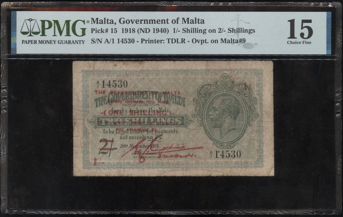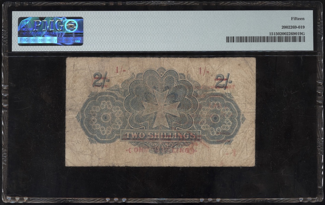 1918年馬爾他1先令加蓋1940年2先令,編號A/1 14530,PMG 15