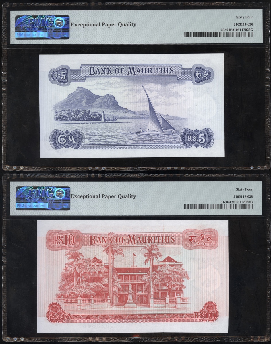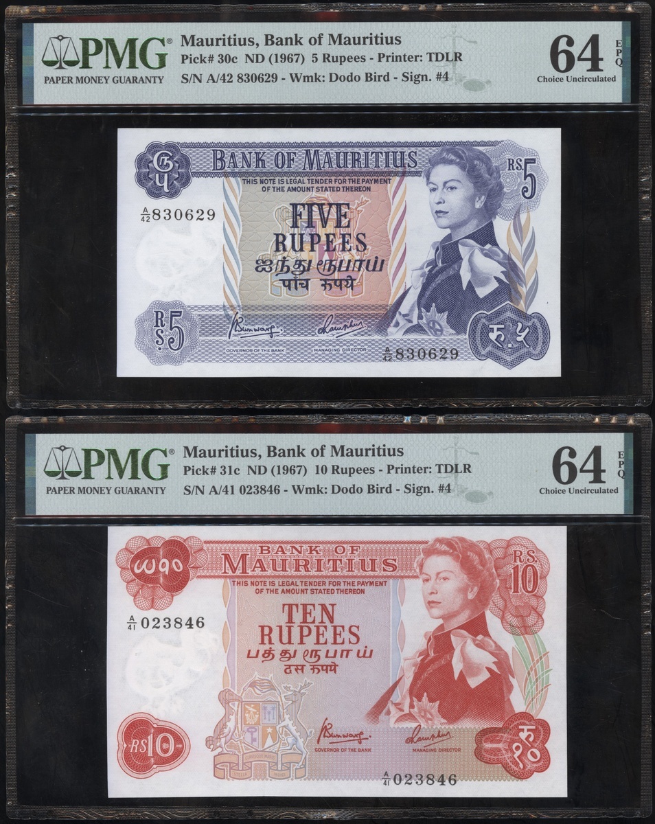 Mauritius, 5 and 10 rupees, ND (1967), serial number A/42 830629 and A/41 023846, (Pick 30c, 31c), both graded PMG 64EPQ Choice Uncirculated (2)