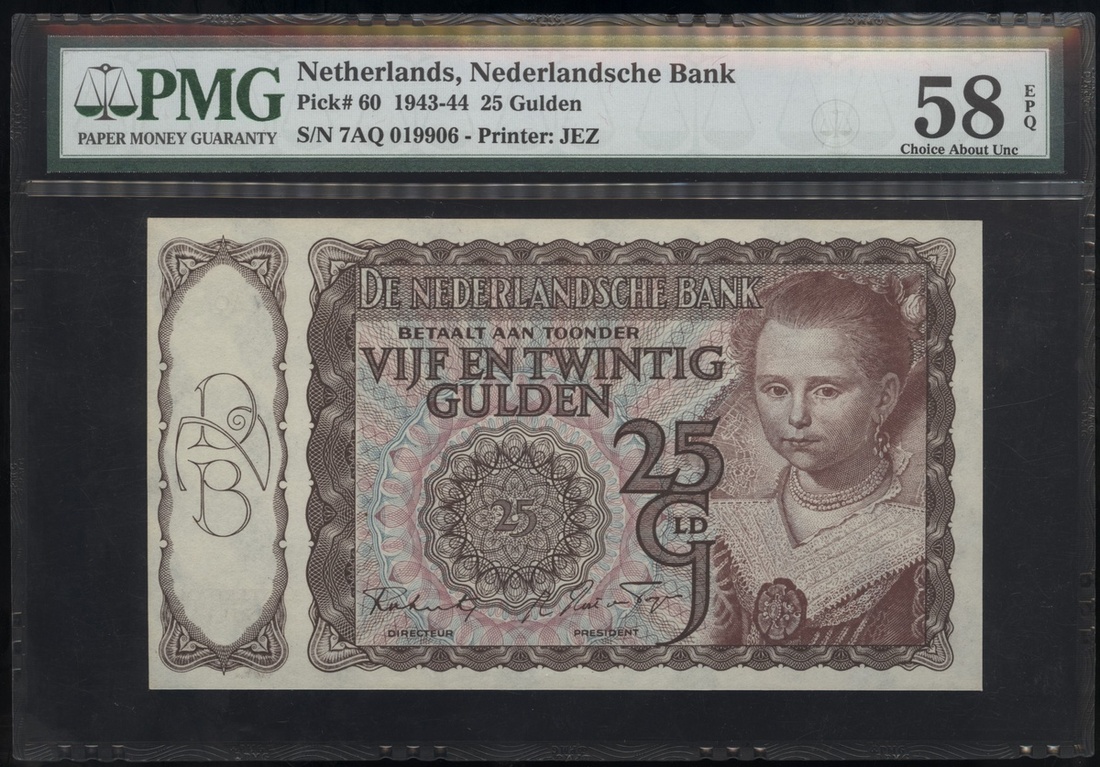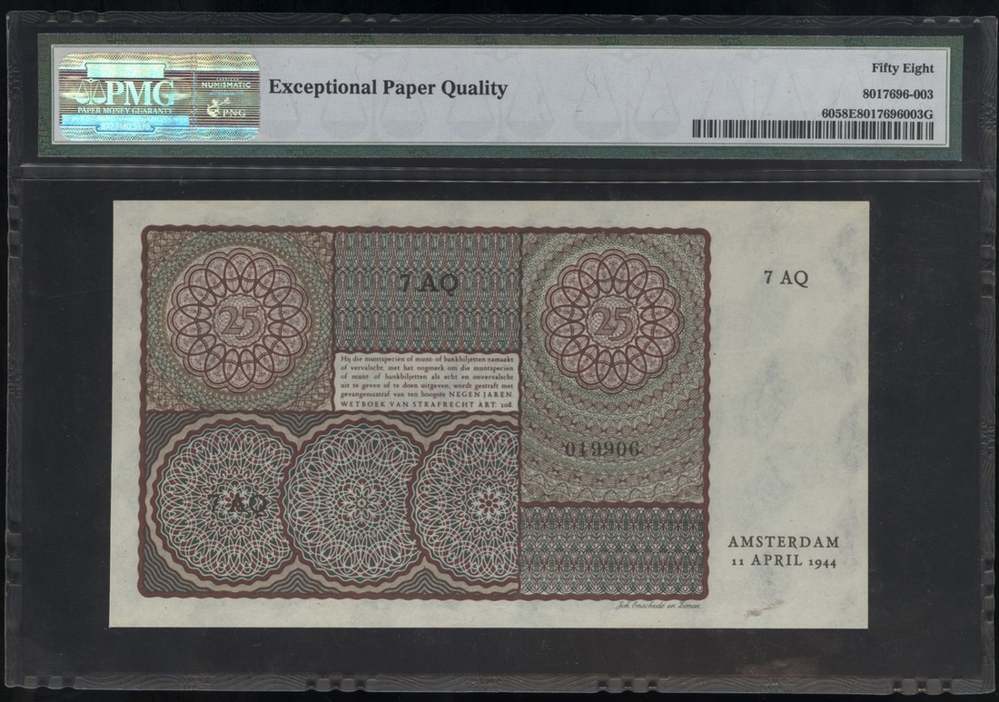 Netherlands: Nederlandsche Bank, 25 Gulden, 11.4.1944, serial number 7AQ 019906, (Pick 60), PMG 58EPQ Choice About Uncirculated