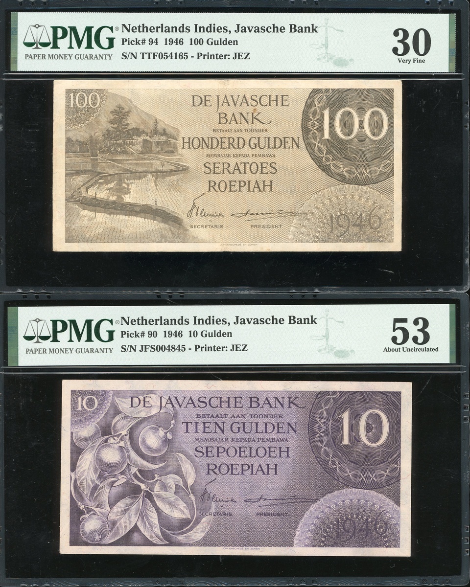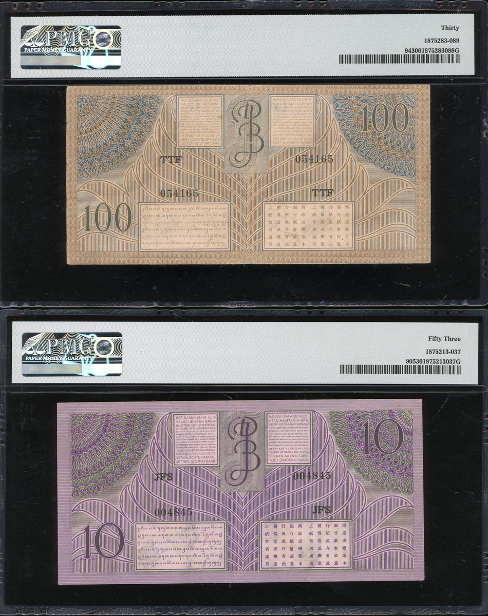 Netherlands Indies, lot of 2 notes, series of 1946, 10 gulden #JFS004845 and 100 gulden #TTF054165,