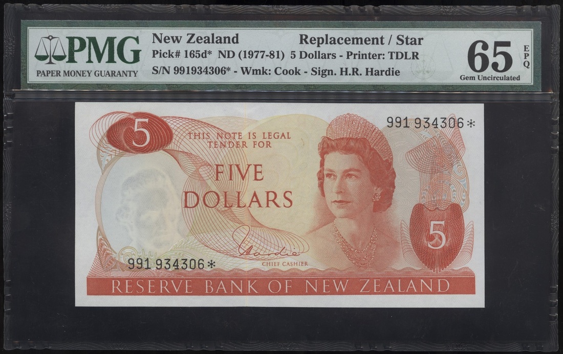 1977-81年新西蘭5元補版連號3枚,編號 991934304*, 991934305* 及 991934306*, 均PMG 65EPQ