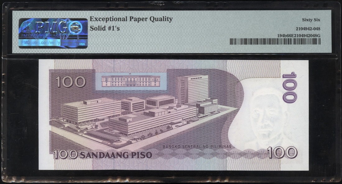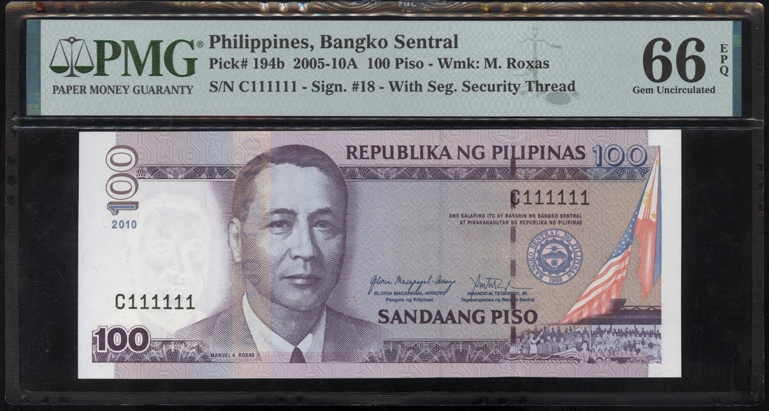 2010年菲律賓100披索全1號,編號C111111,PMG 66EPQ