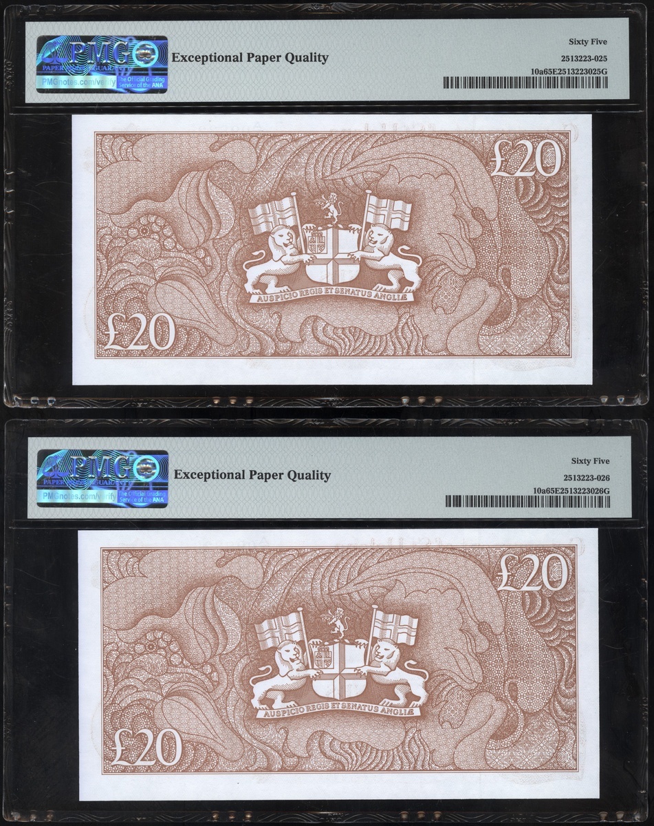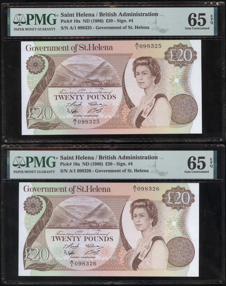無日期(1986)聖海倫娜島20鎊連號2枚,編號A/1 098325-26,PMG 65EPQ