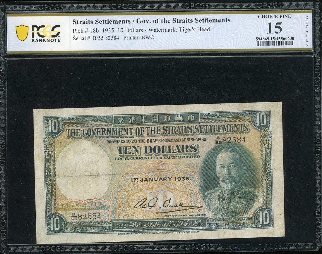 Straits Settlements, $10, 1935, serial number B/55 82584, (Pick 18b), PCGS Banknote 15 Choice Fine (Pieces Added, Multiple Repairs and Design Redrawn).