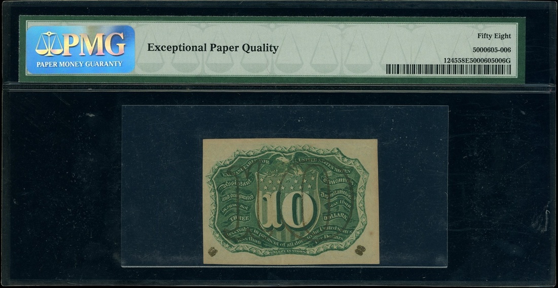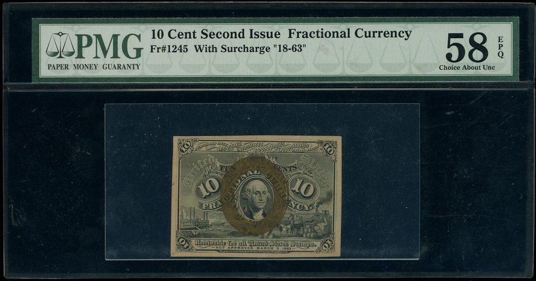 United States of America, 10 cents, fractional currency, second issue with surcharge 18-63, (Fr#1245), PMG 58EPQ Choice About Uncirculated