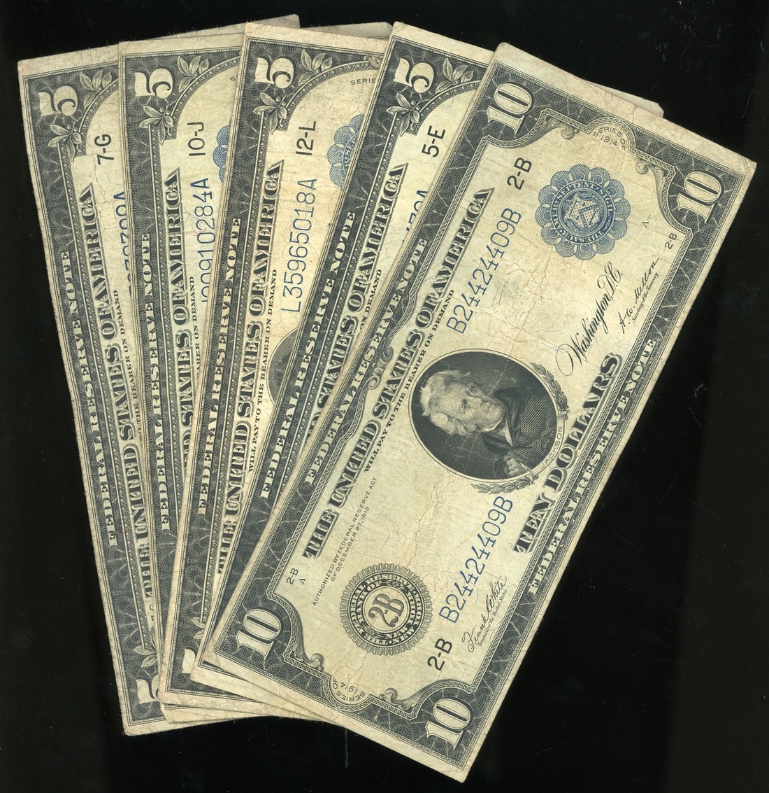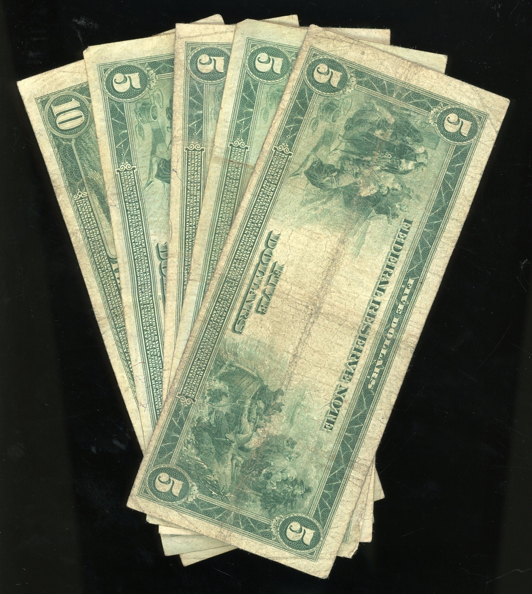 1914年美國紙幣一組6枚,包括50分,以及聯邦儲備局5元4枚及10元1枚,首枚PMG 35,其餘AF,建議預覽